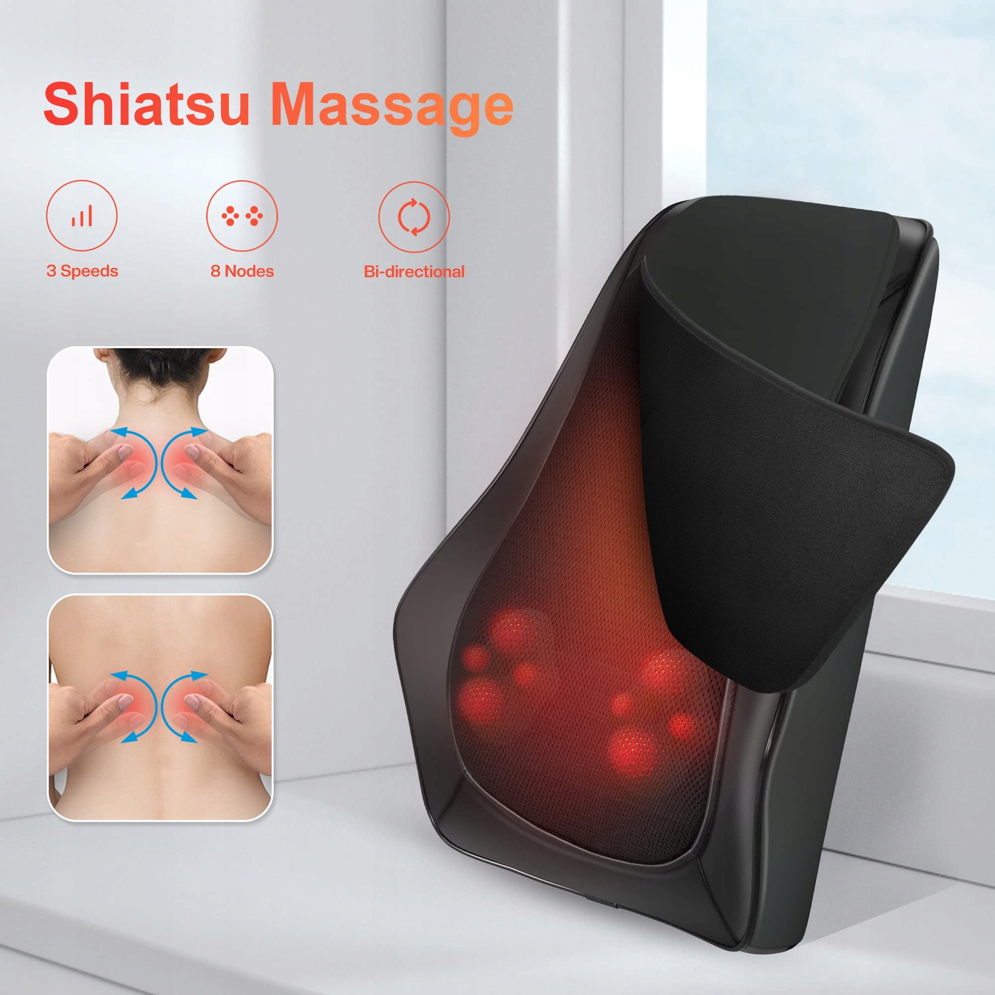 8 węzłów masujących i 3 regulowane intensywności - w przeciwieństwie do innych masażerów na szyję z 4 dużymi twardymi węzłami masującymi, które są niewygodne i bolesne, masażer Comfier do pleców i szyi ma 4 średnie i 4 małe głęboko ugniatające węzły masujące Shiatsu. Dodatkowo dostępne są 3 intensywności: niska, średnia i wysoka, co zapewnia komfortowy masaż dla osób w różnym wieku i na różnych poziomach zmęczenia.