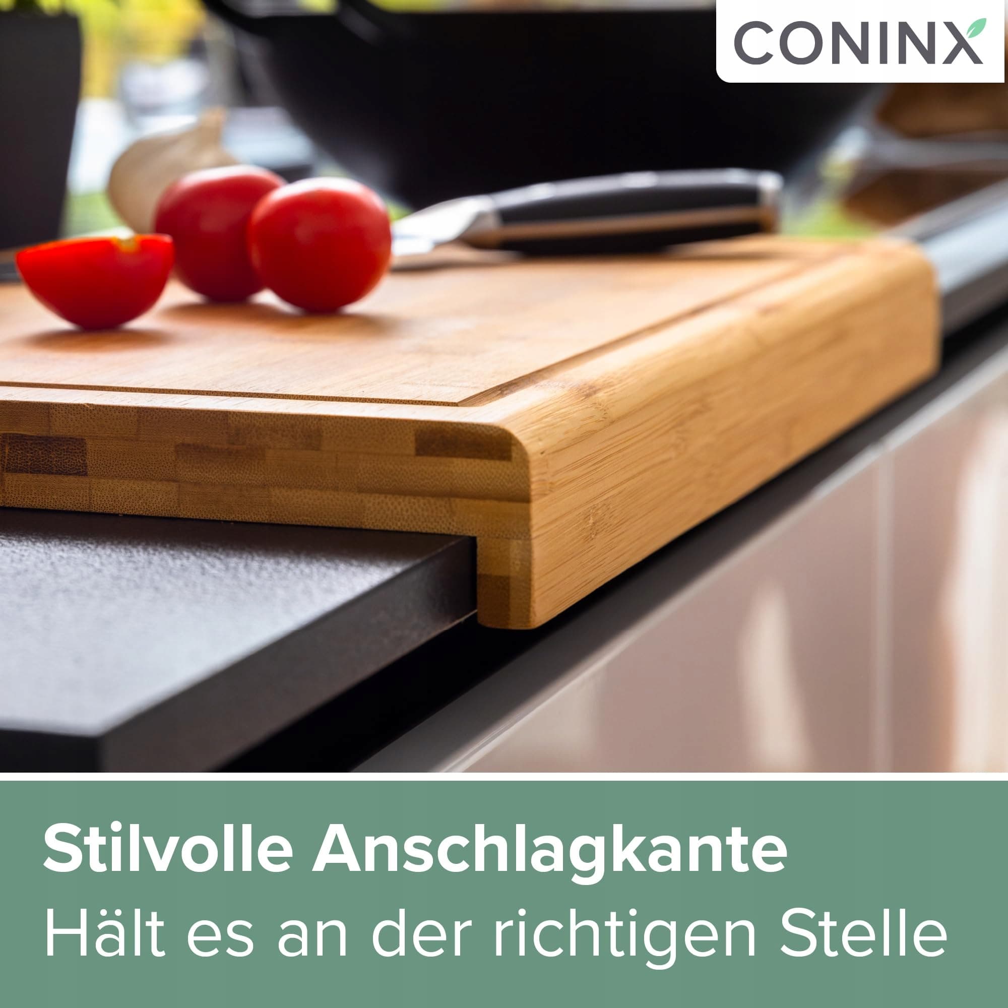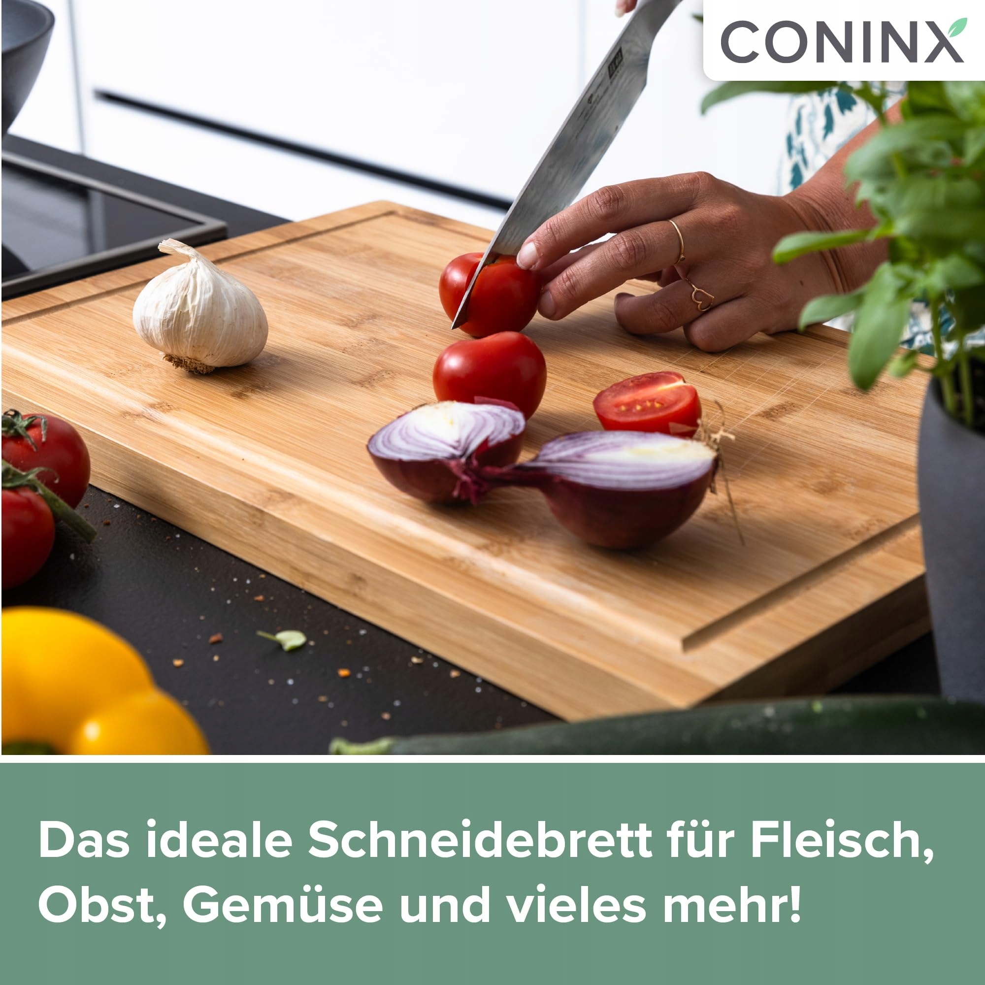 PRZYJAZNA NOŻOM DESKA DO KROJENIA - Deski drewniane są znane z tego, że są bardziej przyjazne dla noży niż deski plastikowe. Miękka, ale solidna deska do krojenia z bambusa od Coninx sprawia, że Twoje noże kuchenne nie zużywają się tak szybko podczas krojenia mięsa lub warzyw.