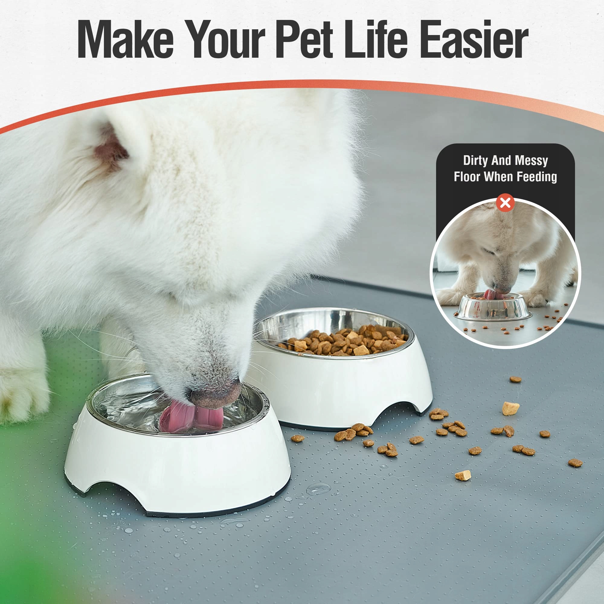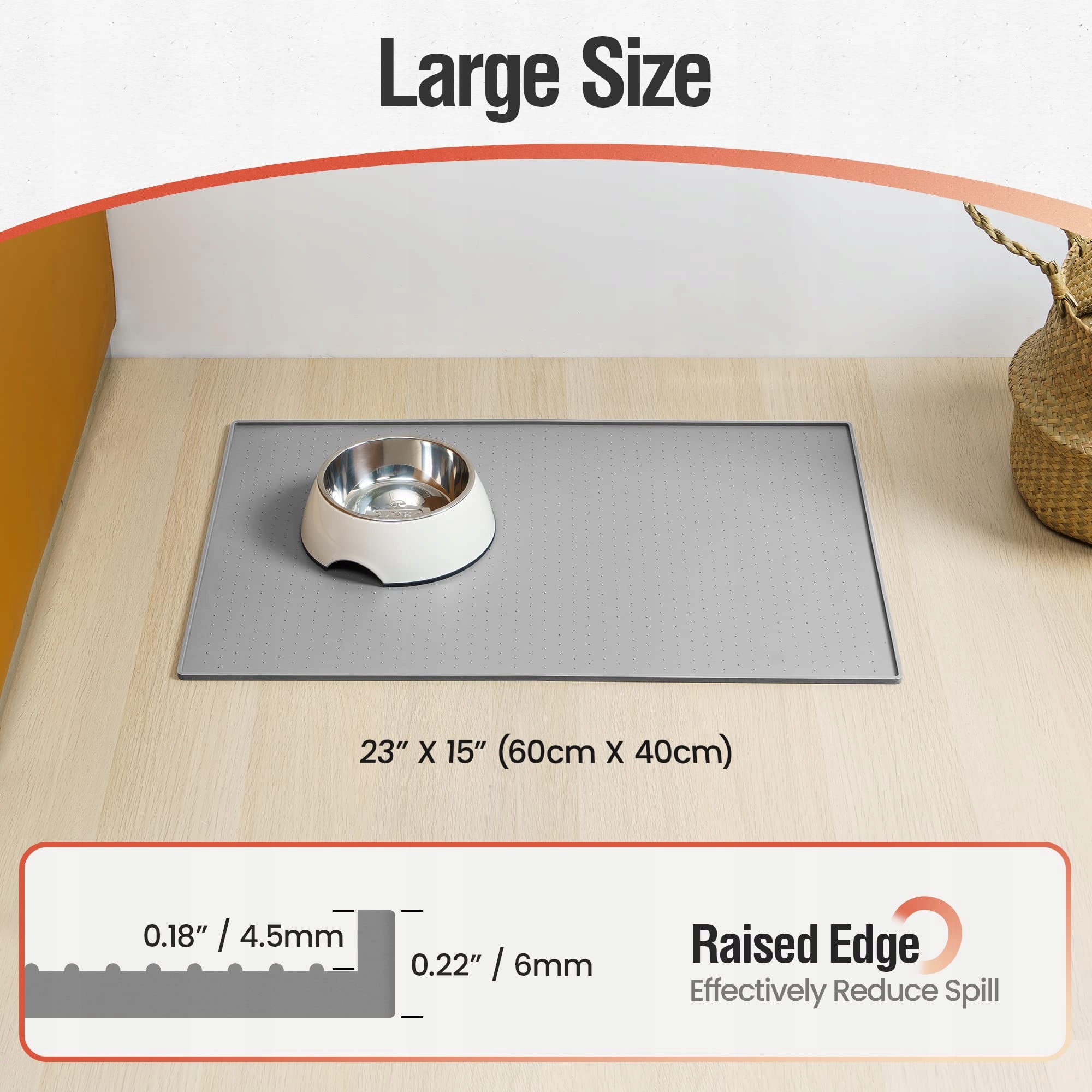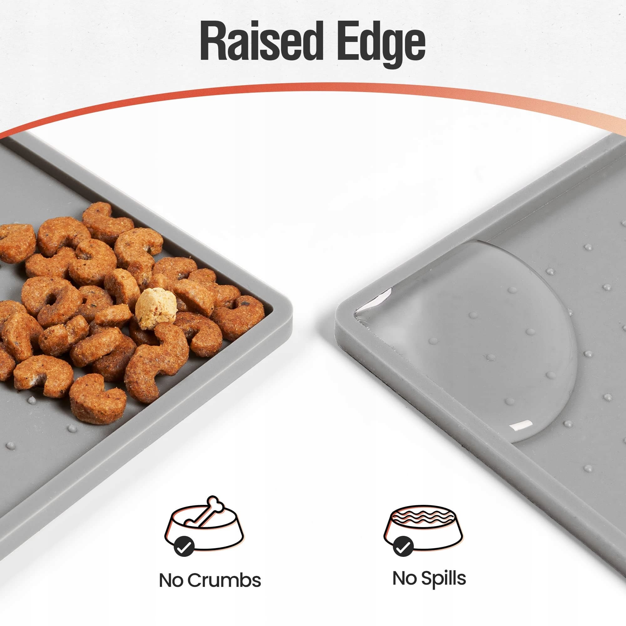 [Eliminacja bałaganu] Mata do karmienia dla psów ma brzeg o wysokości 0,6 cm, który nie tylko zapobiega rozpryskiwaniu wody, ale także pomaga, aby mokre jedzenie nie przyklejało się do podłogi. Nie musisz się martwić, że jedzenie dla psa wpadnie pod lodówkę lub wsunie się pod piekarnik, co zmniejsza konieczność sprzątania po kolacji.