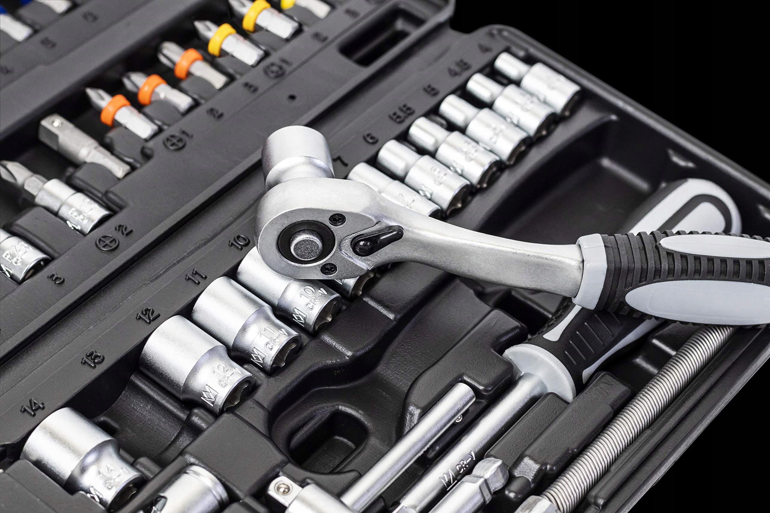 DOBRA JAKOŚĆ WYKONANIA: Klucz z przełącznikiem z 72 zębami i funkcją szybkiego zwalniania | Nasadki wykonane z wytrzymałej stali chromowo-wanadowej | Bity z kodowaniem kolorystycznym dla łatwego przyporządkowania | Wytrzymała i poręczna walizka z tworzywa sztucznego