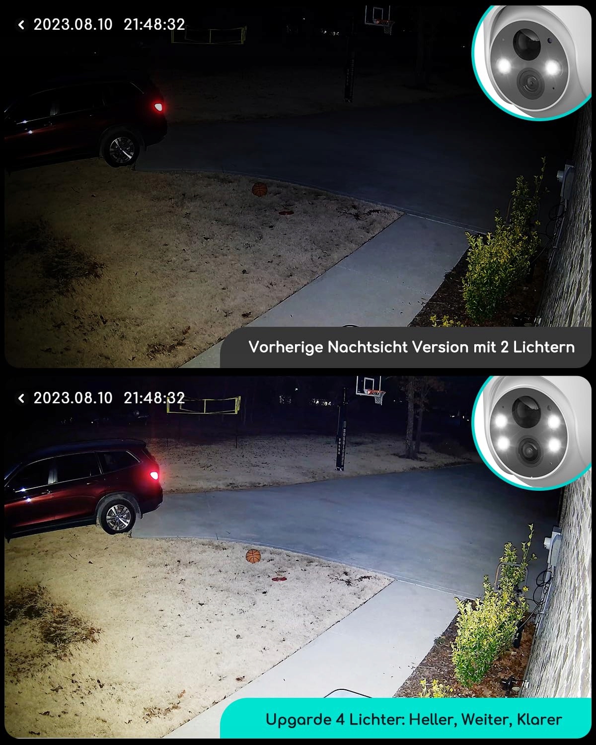 【2K FHD i kolorowy tryb nocny】Ta bezprzewodowa kamera monitorująca na zewnątrz WLAN jest wyposażona w rozdzielczość 2K oraz 4 lampy combo, aby dostarczyć ostrzejszy i płynniejszy obraz niż 1080p. A gdy włączysz tryb inteligentnego lub kolorowego nocnego widzenia, możesz łatwo uchwycić ważne szczegóły zdarzenia nawet w nocy, gdy brak oświetlenia (np. kolor ubrania, kolor pojazdów, środki kamuflażu, cechy podejrzanych), dostarczając policji cenne informacje.