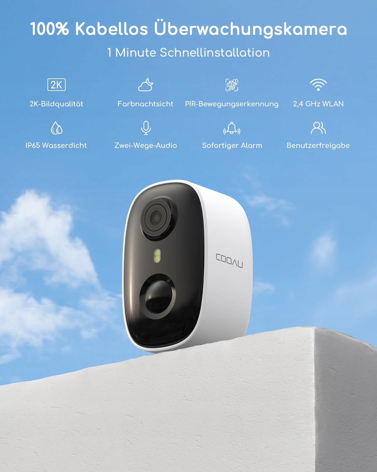 [Ulepszona rozdzielczość 2K i 100 % bezprzewodowość] Kamera Wlan COOAU o rozdzielczości 2K-FHD (2304 * 1296), która jest 1,4 razy wyraźniejsza niż 1080P, zapewnia wyższą jakość obrazu monitoringu wideo. Wyposażona w akumulator i zasięg WLAN zwiększony o 20 %, uciążliwe okablowanie staje się zbędne, a nawet laik może skonfigurować ją w ciągu kilku minut.