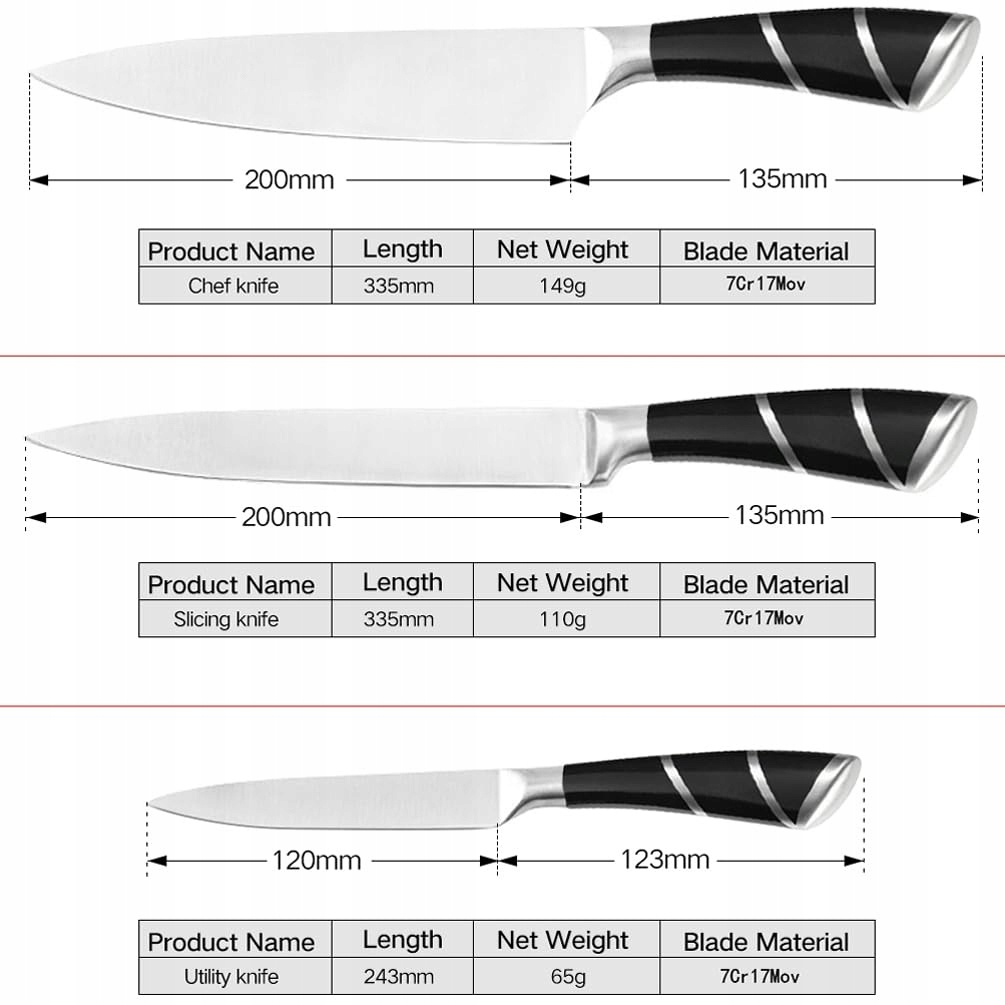 Pełny zestaw noży z blokiem: 3 sztuki: 1X nóż kuchenny, 1X nóż do krojenia, 1X nóż uniwersalny. Jest bardzo wygodny do ostrzenia noża. Każda krawędź ostrza jest ręcznie polerowana do 15° z każdej strony dla długotrwałej ostrości i łatwego ostrzenia.