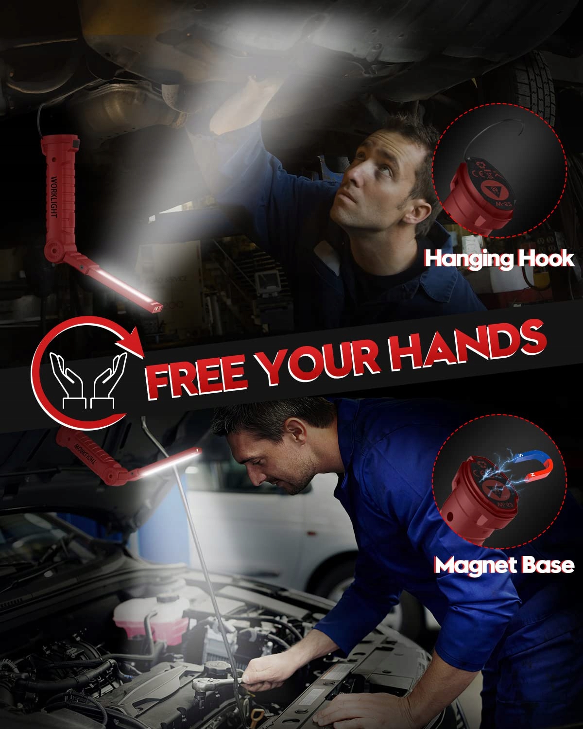 Magnetyczna podstawa i hak: Dzięki mocnej podstawie magnetycznej ta lampa robocza może być przymocowana podczas napraw lub pracy do każdego metalu, takiego jak pojazdy i miejsca pracy. Hak jest bardzo praktyczny, aby umieścić tę latarkę LED w dowolnym miejscu i mieć wolne ręce do zakończenia pracy.