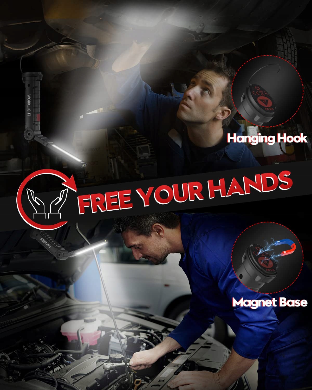 Magnetyczna Podstawa i Hak: Dzięki mocnej podstawie magnetycznej ta lampa robocza może być przymocowana podczas napraw lub pracy na każdym metalu, takim jak pojazdy i miejsca pracy. Hak jest bardzo praktyczny, aby umieścić tę lampę LED w dowolnym miejscu i mieć wolne ręce, aby zakończyć pracę.