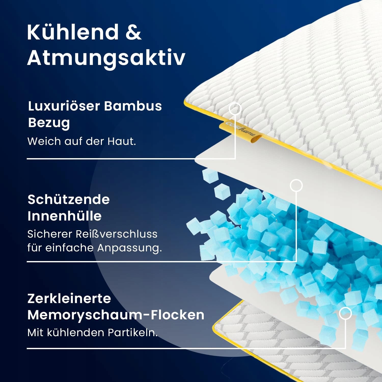 Miękka i oddychająca: Dwustronna bambusowa poduszka jest oddychająca i zapewnia optymalną cyrkulację powietrza. Temperaturowo regulujące cząsteczki żelu chłodzącego zapobiegają nadmiernemu nagrzewaniu, dzięki czemu możesz spać przyjemnie chłodno przez całą noc i nie pocić się.