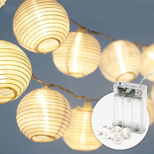 ✨ DANE: 7 metrów całkowitej długości na baterie | Kabel połączeniowy 2,2 metra | Skrzynka na baterie 3AA z timerem | 20 lampionów w ciepło-białym świetle na zewnątrz | Kolor klosza: Biały | Kabel: Przezroczysty (niezauważalny)