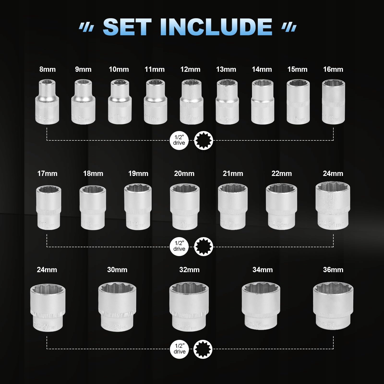 【Duży wybór rozmiarów】: Zestaw kluczy nasadowych 1/2 cala zawiera łącznie 21 części, w tym 8, 9, 10, 11, 12, 13, 14, 15, 16, 17, 18, 19, 20, 21, 22, 24, 27, 30, 32, 34 i 36 mm.