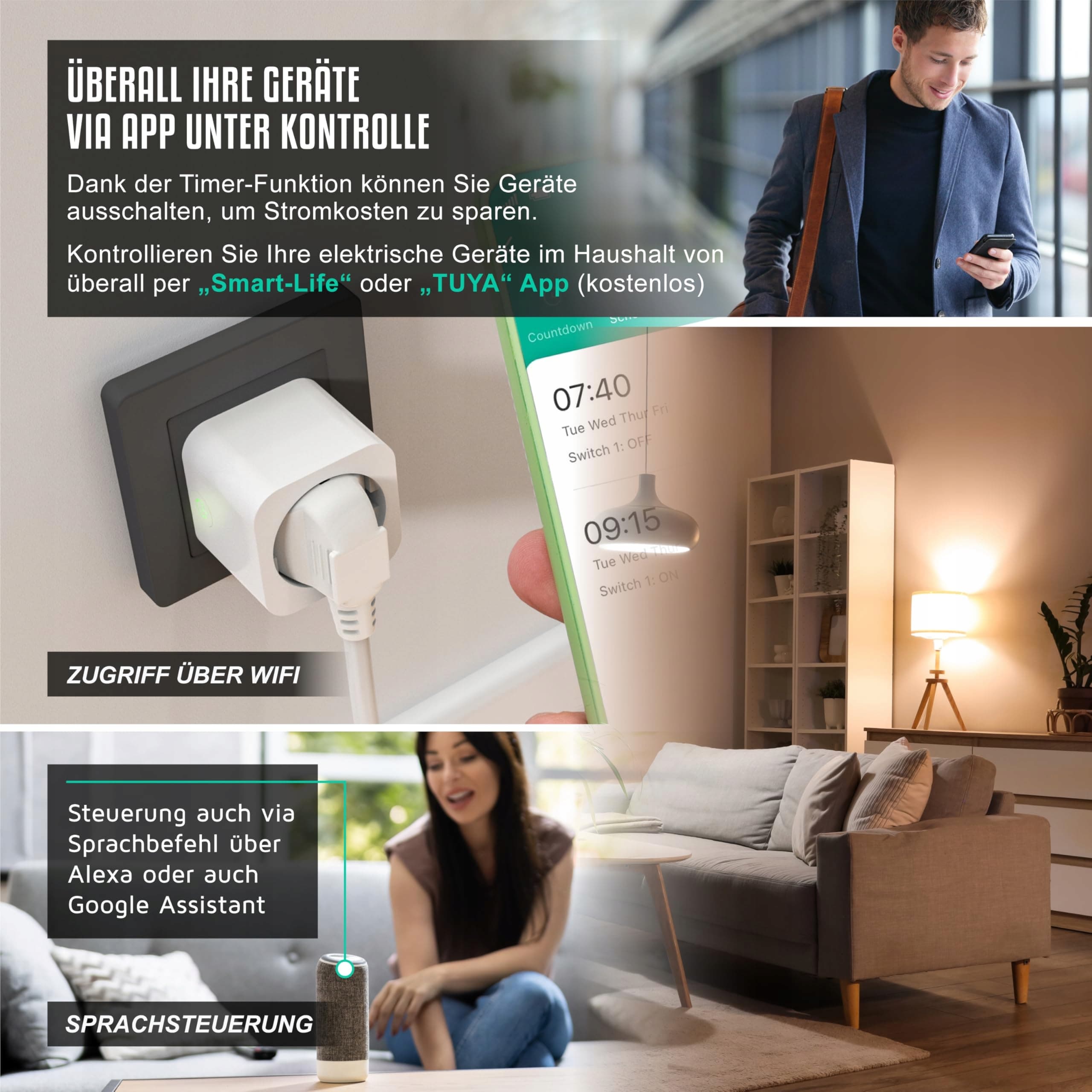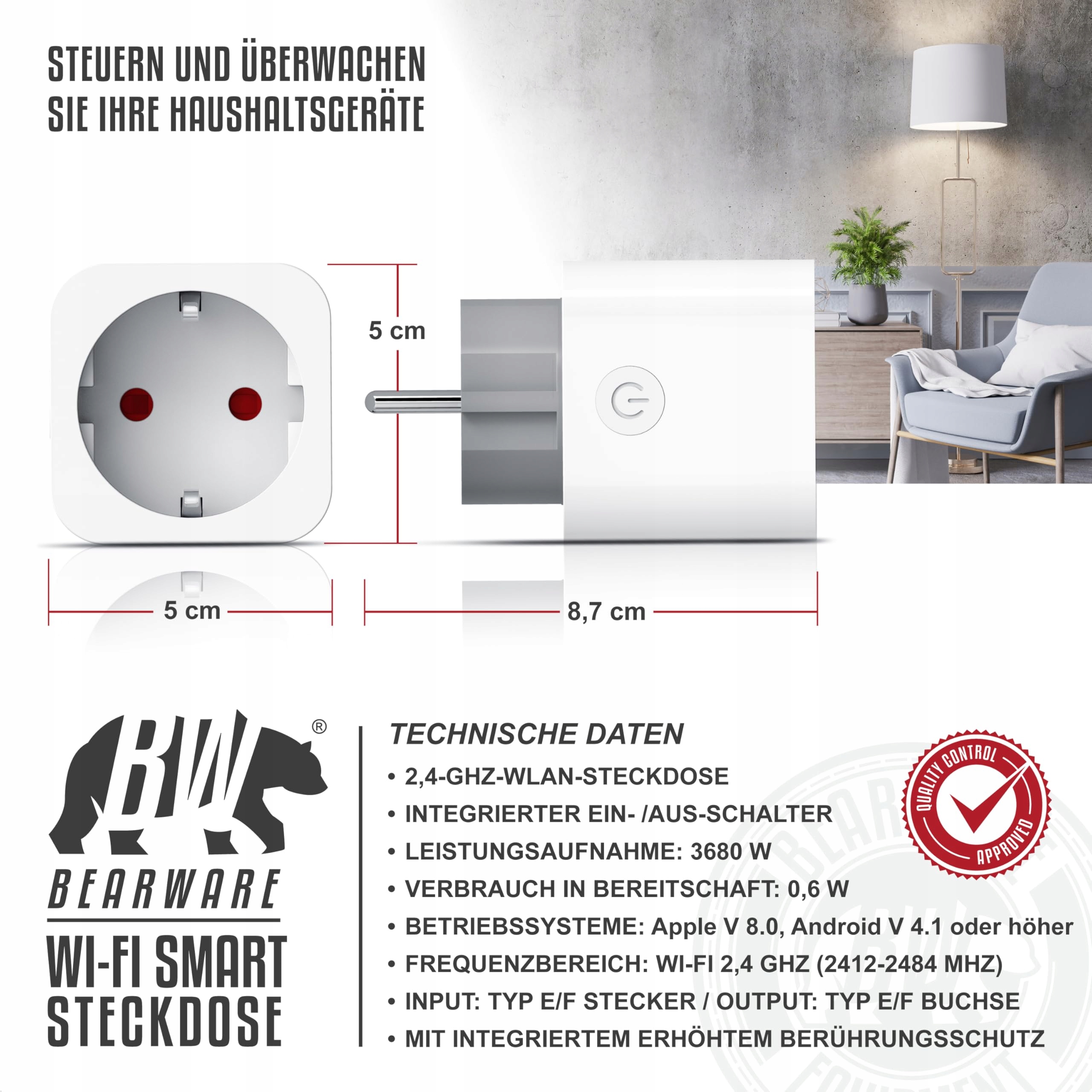 PEŁNA KONTROLA NAD TWOIMI URZĄDZENIAMI DOMOWYMI: Dzięki gniazdku Bearware możesz zdalnie sterować podłączonymi urządzeniami, takimi jak lampy, wentylatory czy ekspresy do kawy. Wszystko, czego potrzebujesz, to smartfon i darmowa aplikacja 'Smart Life' lub 'Tuya Smart'. | 306973