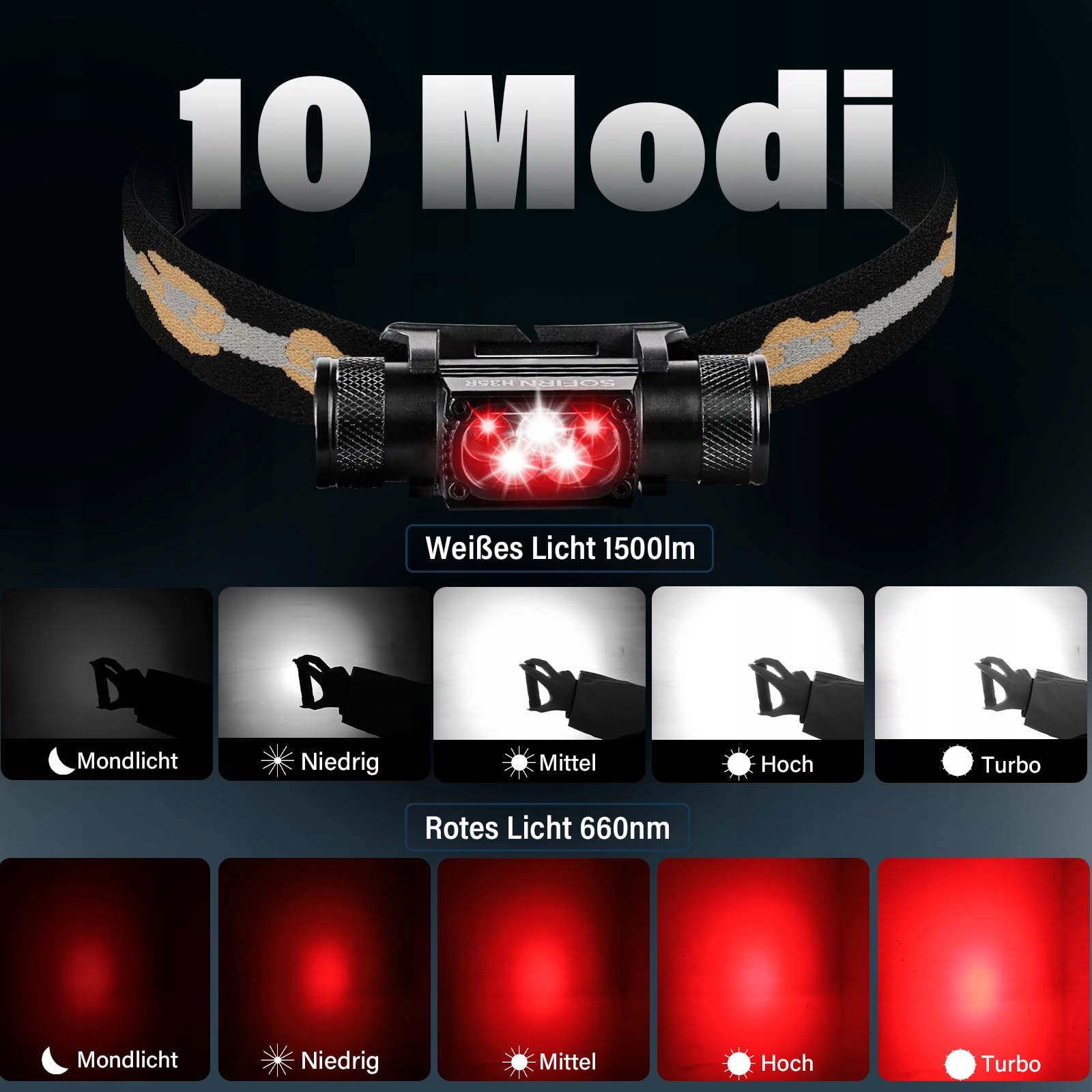 Superjasna latarka czołowa: Oferuje maksymalną moc 1500 lumenów i zasięg do 122 metrów, idealna do oświetlania średnich i bliskich odległości. Z aż 10 różnymi trybami oświetlenia doskonale nadaje się do wielu aktywności na świeżym powietrzu, takich jak polowanie, wędkowanie, bieganie itp.