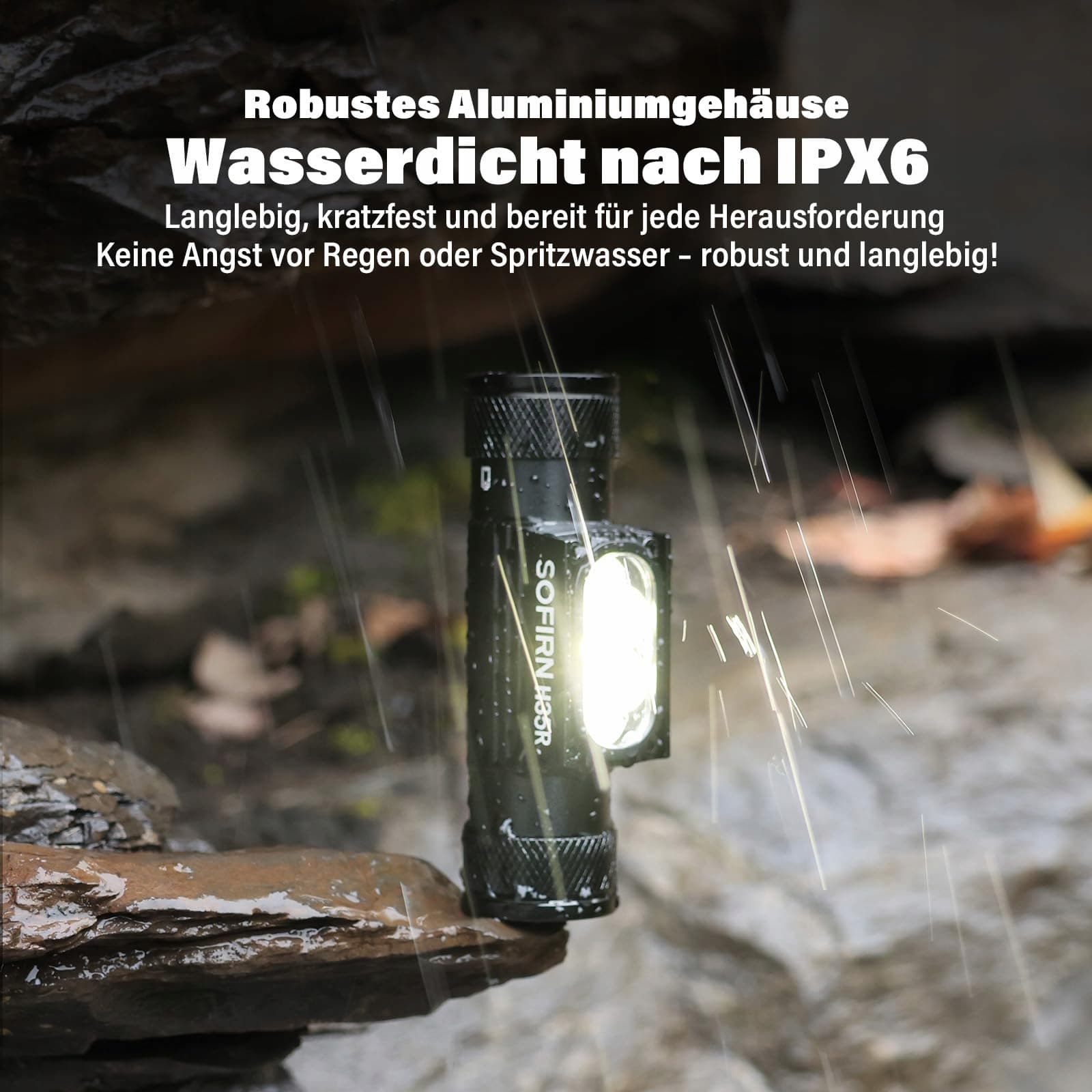 Wodoodporna latarka czołowa: Latarka wykonana jest z wytrzymałego aluminium. Dzięki wodoodporności IP68 i odporności na upadki z wysokości do 1,5 metra, Sofirn H35R jest idealnym towarzyszem na co dzień, do pracy i przygód.