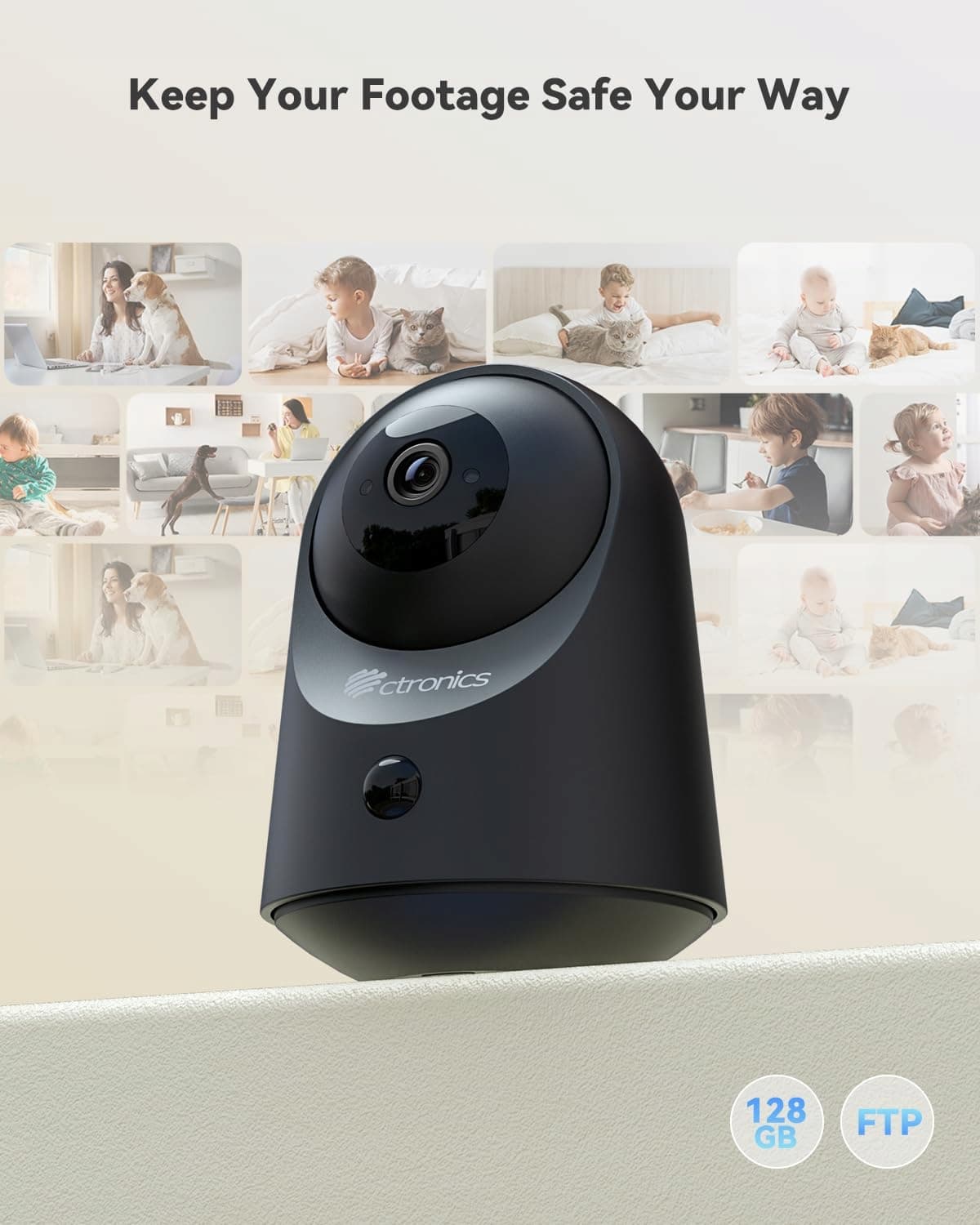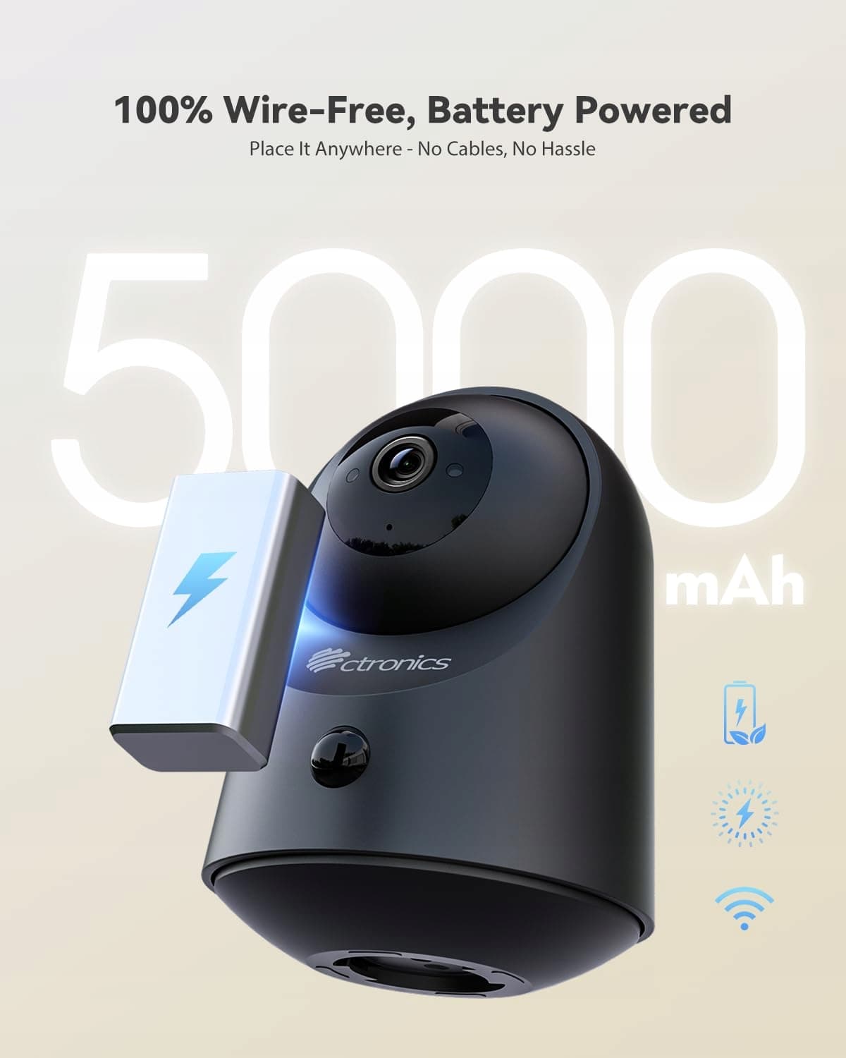 Ctronics 2K Kamera do monitoringu z akumulatorem do użytku wewnętrznego WLAN, 100% bezprzewodowa, 3MP 20m podczerwień widzenie nocne, PC i aplikacja, FTP/Cloud/128GB SD, 360° PTZ, wykrywanie PIR, dwukierunkowe audio, (2,4GHz WiFi, Pro)