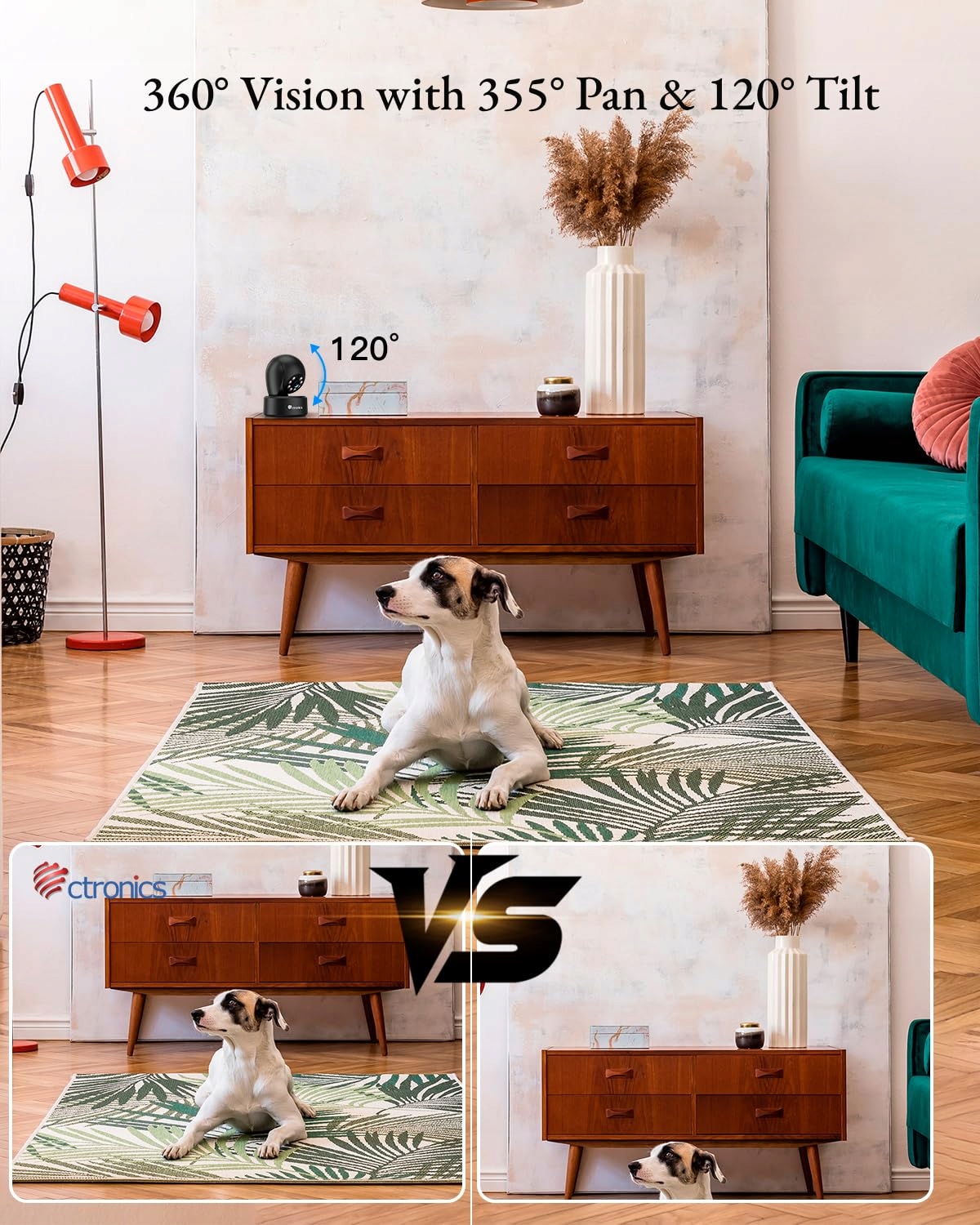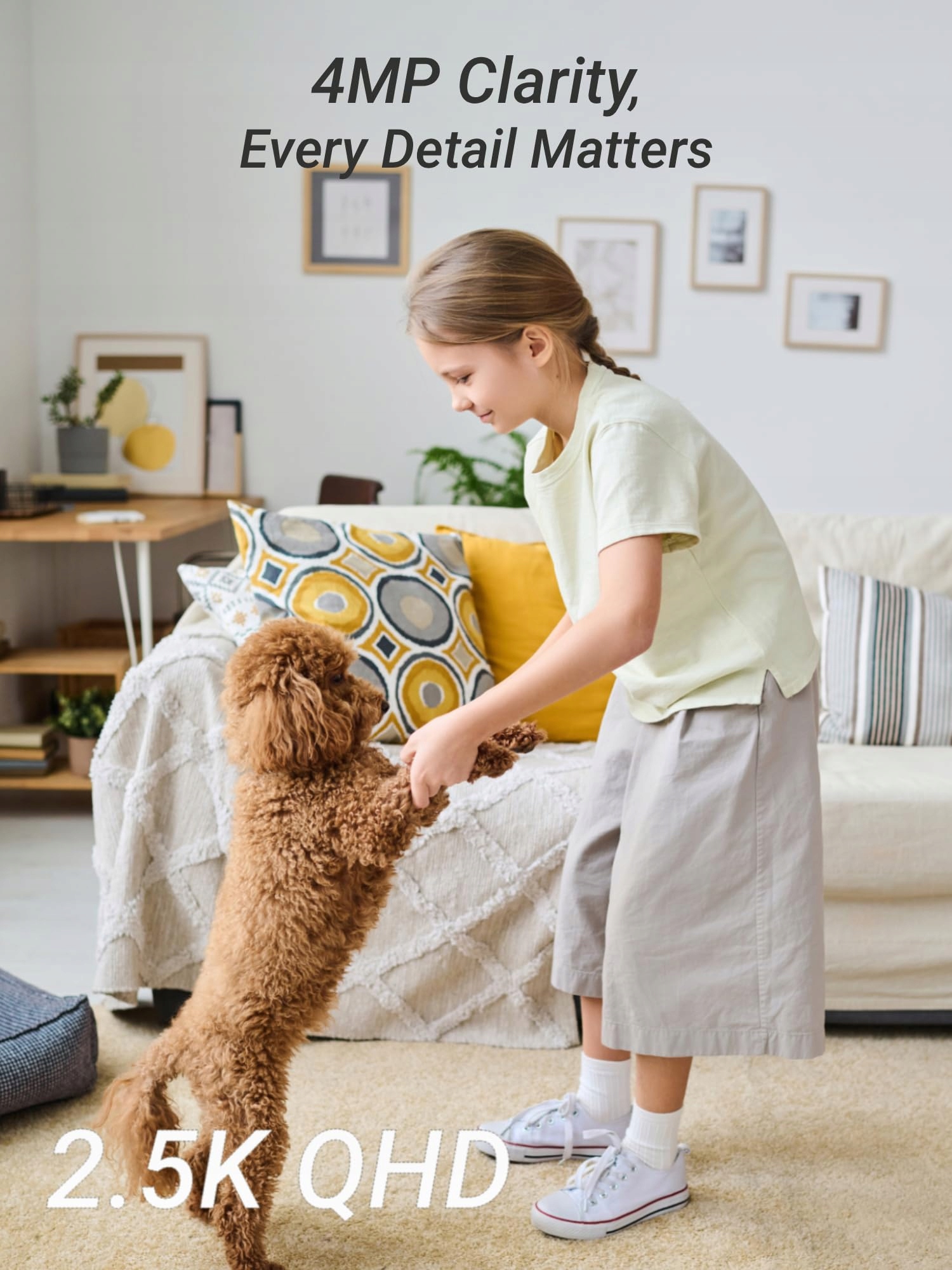 【2.5K Super HD z kontrolą PTZ 355°/120°】 Wyposażona w obiektyw 4MP, ta kamera WLAN oferuje wyraźną rozdzielczość 2.5K. Zakres obrotu 355° i kąt pochylenia 120° umożliwiają pełny monitoring pomieszczenia bez martwych punktów.