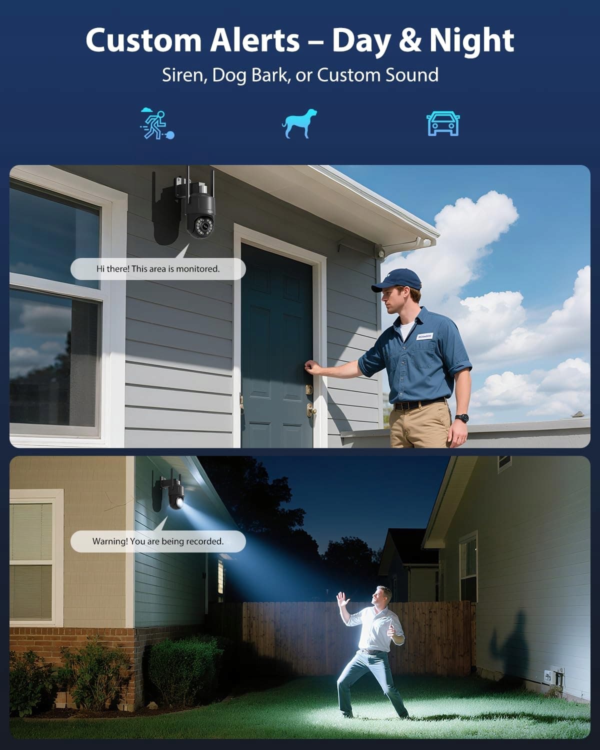 4️⃣ Aktywne odstraszanie: czerwono-niebieskie światło alarmowe i syrena Jasne czerwono-niebieskie błyskające światła w połączeniu z głośną syreną natychmiast odstraszają intruzów – dla większego bezpieczeństwa wokół domu, ogrodu lub garażu.