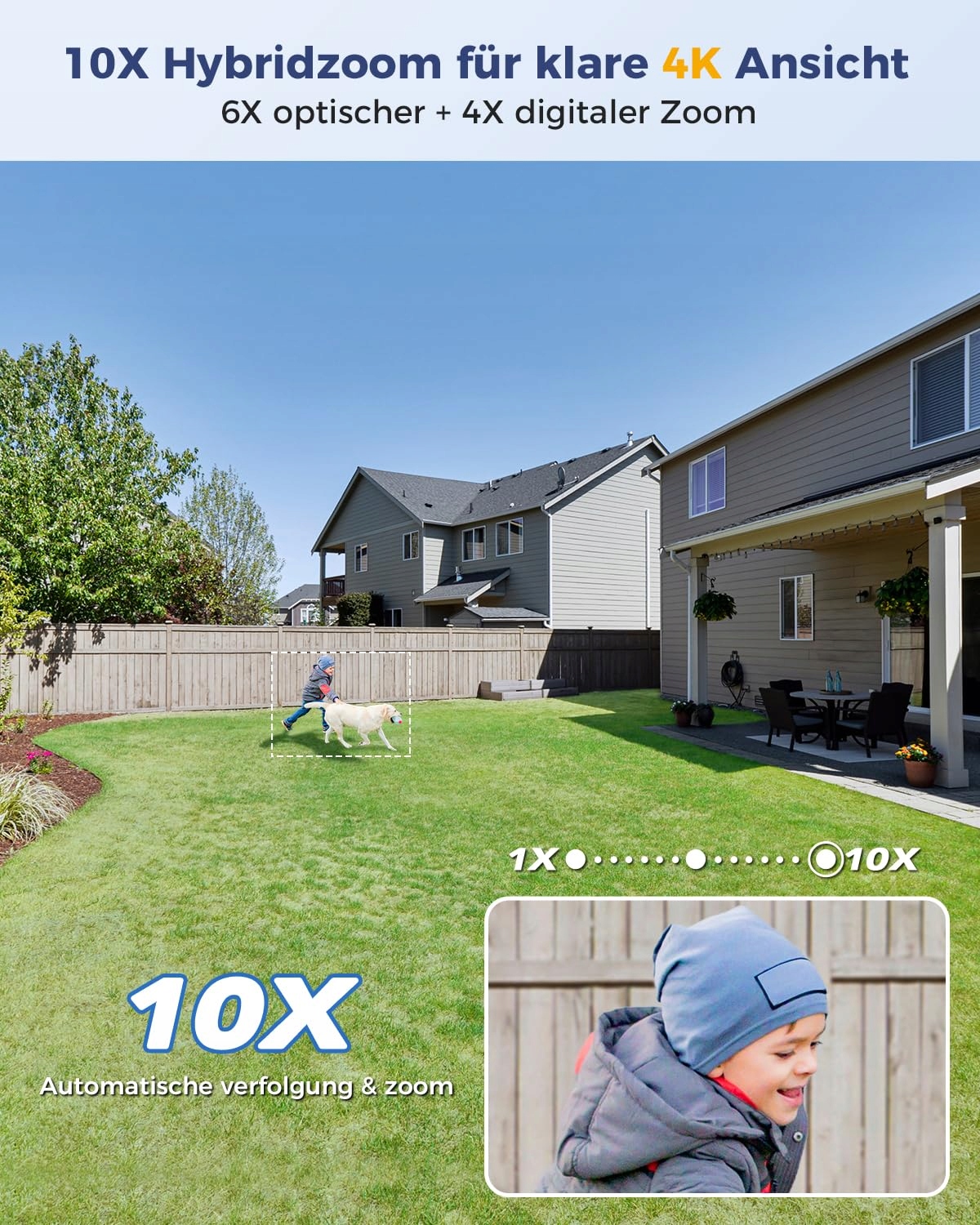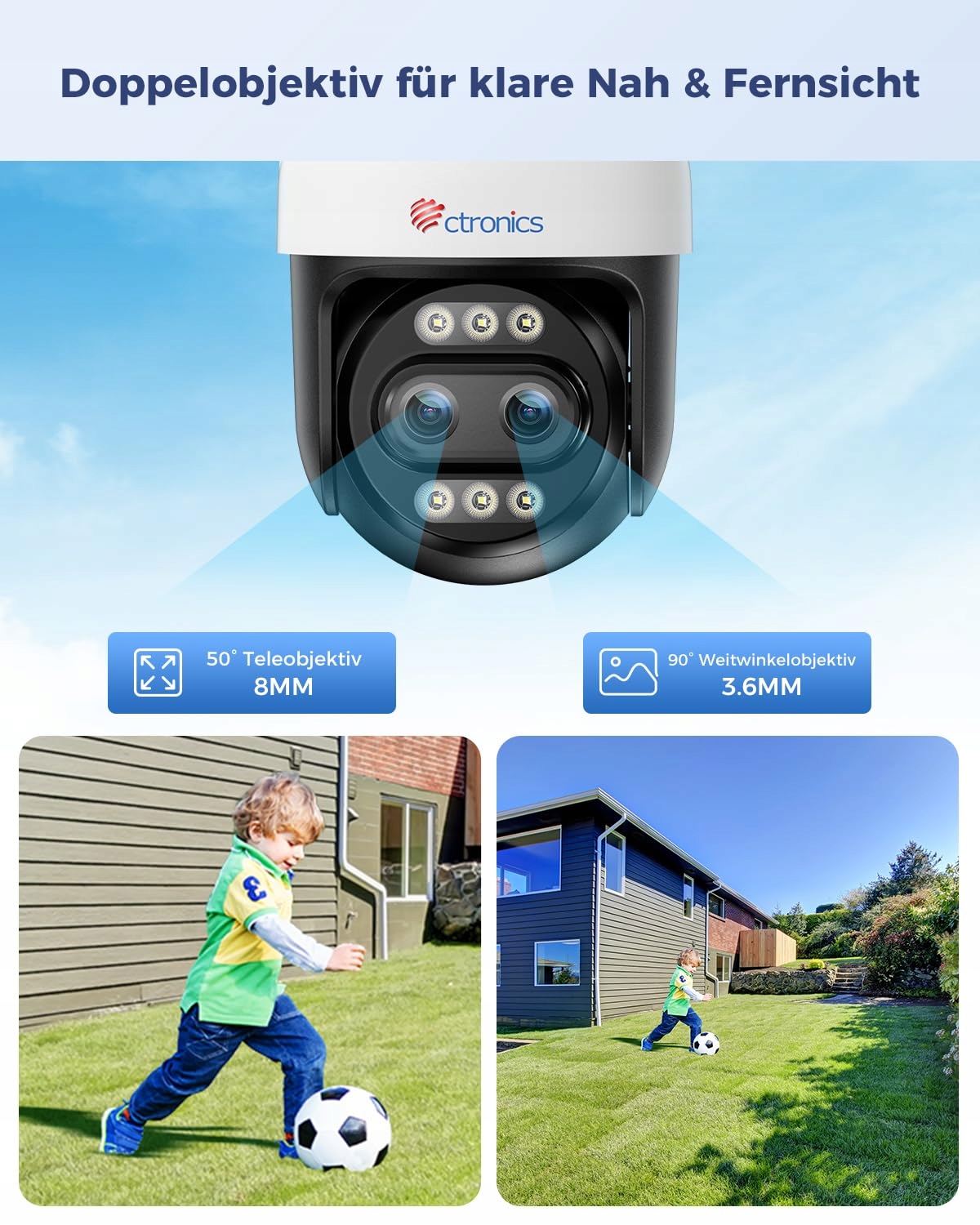 【Podwójny obiektyw i 10-krotny hybrydowy zoom – szeroki kąt i widok szczegółów】Kamera monitoringu zewnętrznego posiada obiektyw szerokokątny 3,6 mm o kącie widzenia 90° oraz teleobiektyw 8 mm do ujęć z bliska o kącie 50°. Dzięki hybrydowemu zoomowi, łączącemu 6-krotny zoom optyczny i 4-krotny zoom cyfrowy, kamera monitoringu zewnętrznego przełącza się jednym dotknięciem między szerokim kątem a widokiem z bliska, zapewniając wyraźny monitoring dużych obszarów i precyzyjne uchwycenie detali.