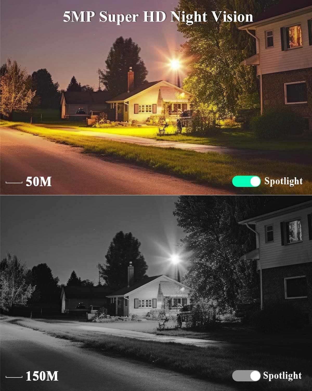【150M Nocne Widzenie i Czerwone oraz Niebieskie Światła Ostrzegawcze】 Kamera monitoringu zewnętrznego 5MP jest wyposażona w 2 laserowe diody IR, 4 diody IR oraz 4 białe diody LED, oferując wyraźne nocne widzenie do 150 m lub 50 m pełnokolorowego nocnego widzenia. Możesz wybrać spośród trzech trybów nocnego widzenia. Gdy kamera kopułkowa zewnętrzna wykryje osoby, czerwone i niebieskie światła migają, a alarm dźwiękowy zostaje uruchomiony. Dźwięk alarmu można dostosować indywidualnie.