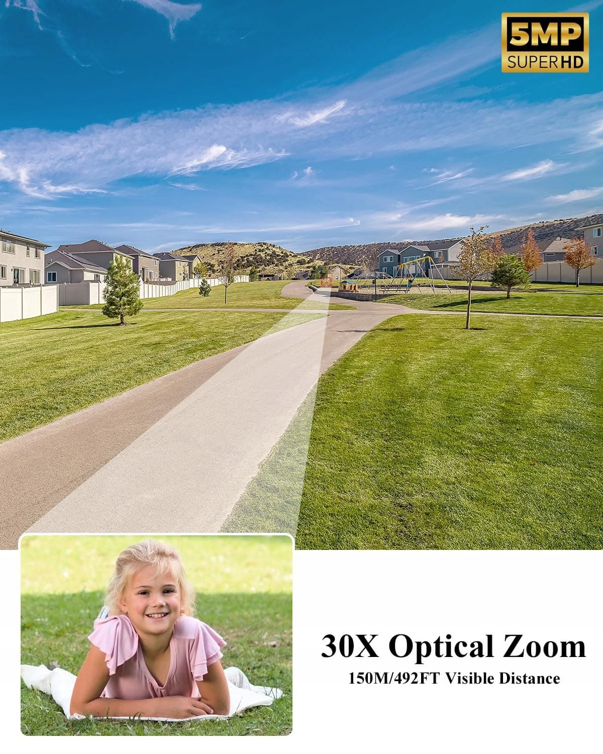 【30X Optyczny Zoom i 5MP HD Rozdzielczość】 Kamera monitoringu zewnętrznego Ctronics WLAN dostarcza obrazy o wysokiej rozdzielczości 5MP (2560 x 1920 P). Ta kamera WLAN outdoor obsługuje również 30X optyczny zoom oraz automatyczny zoom, dzięki czemu możesz swobodnie przybliżać bez obaw o rozmyte obrazy. Kamera PTZ WLAN obsługuje kąt widzenia 355°/90°, bez martwych punktów czy brakujących narożników. Możesz również zdalnie sterować obrotem kamery ze swojego smartfona.