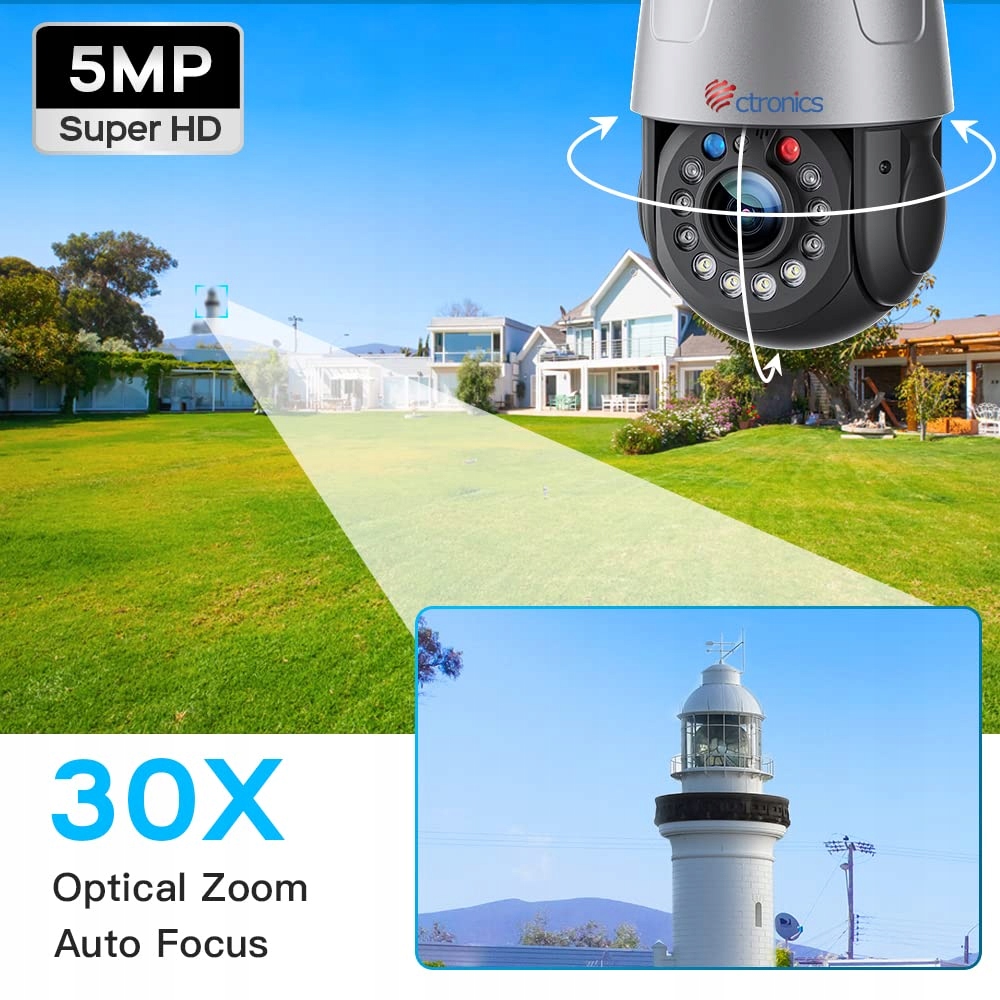 【30-krotny zoom optyczny i rozdzielczość 5 MP】 Ta kamera do monitoringu zewnętrznego z kartą SIM oferuje rozdzielczość 5 MP (2560 x 1920) i obsługuje również 30-krotny zoom optyczny oraz autofocus, co zapewnia wyraźny obraz podczas powiększania wideo i zdjęć. Ta 4G kamera do monitoringu zewnętrznego obsługuje obrót PTZ o 355° w poziomie i 90° w pionie. Po prostu przesuwaj palcem po ekranie, aby oglądać z każdego kąta.