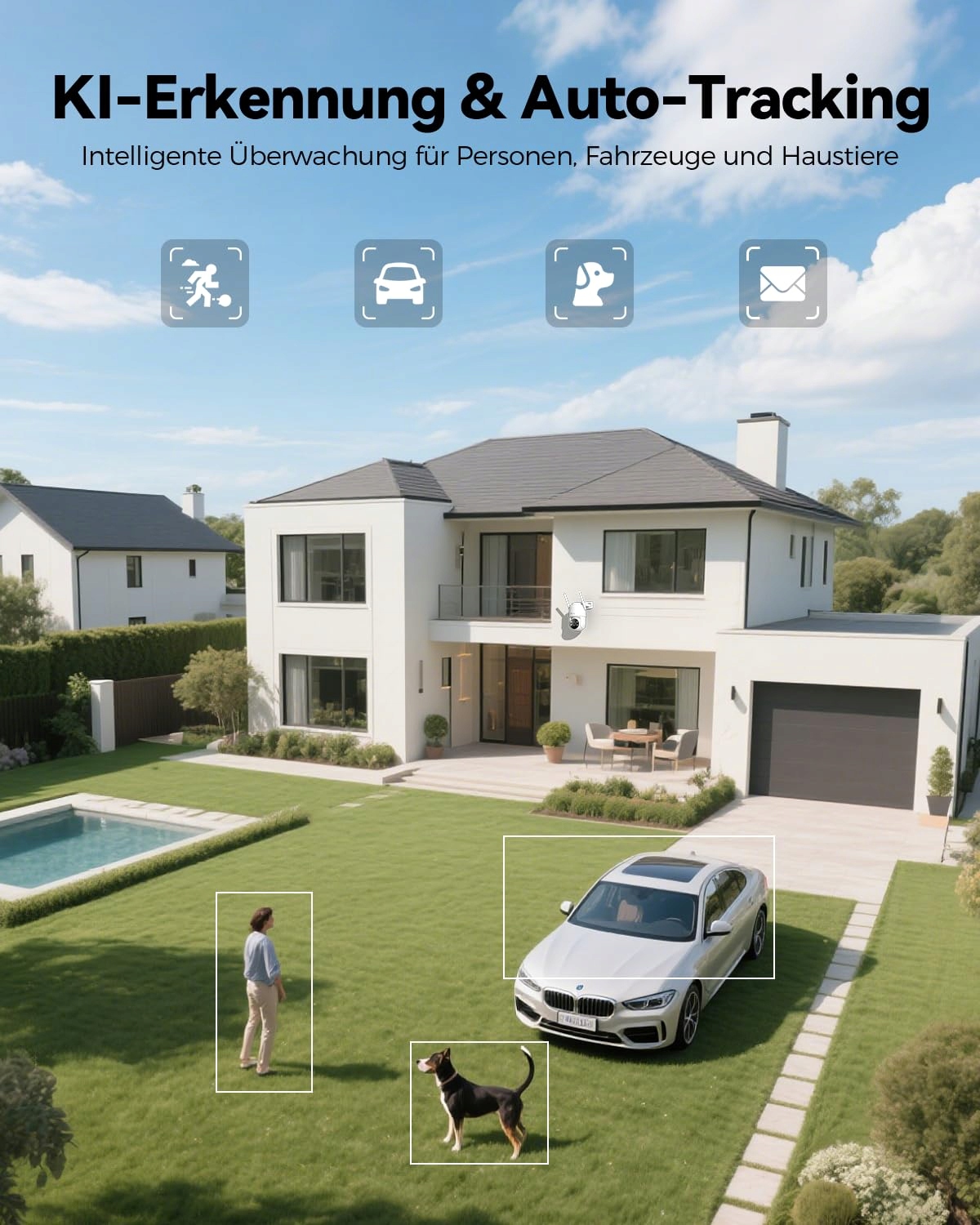 【Wykrywanie AI i automatyczne śledzenie】 Wyposażona w zaawansowane wykrywanie AI, ta zewnętrzna kamera WLAN obsługuje cztery inteligentne tryby: ruch, człowiek, pojazd i zwierzę. Z zakresem PTZ 355°90° i 4-krotnym zoomem cyfrowym zapewnia precyzyjne śledzenie celów. Gdy zewnętrzna kamera IP WiFi wykryje ruch, natychmiast wysyłane są powiadomienia przez aplikację Ctronics Pro, w tym powiadomienia e-mail, abyś był zawsze poinformowany i bezpieczny.