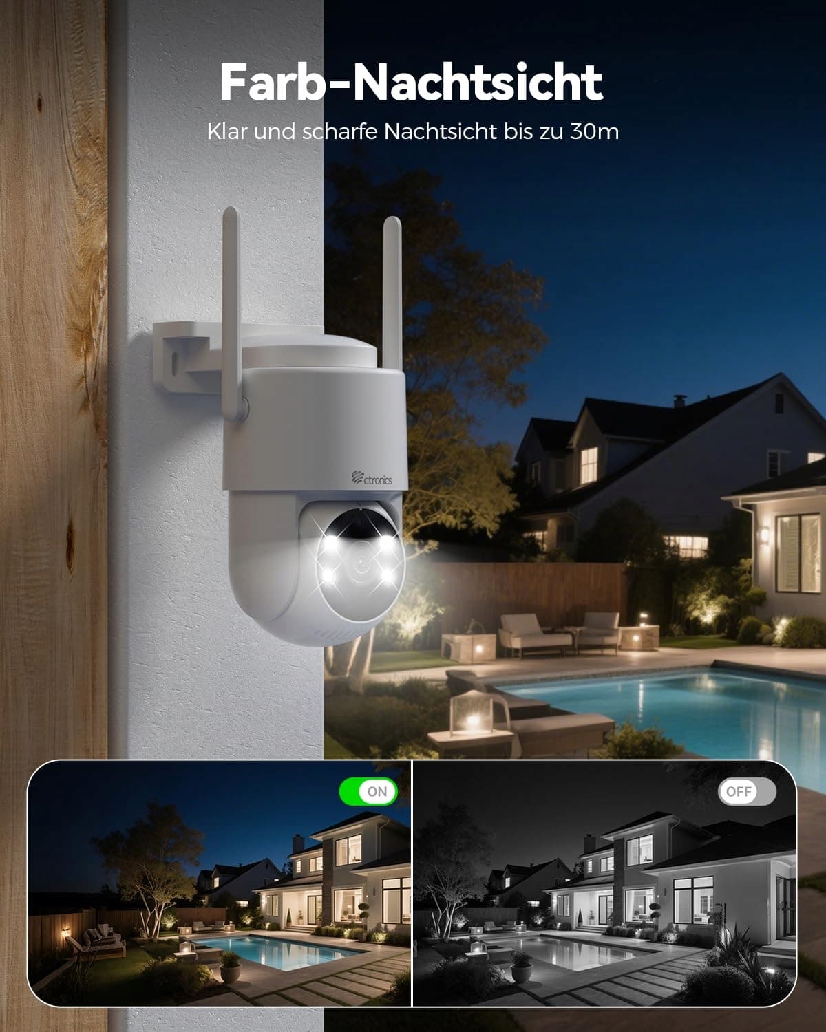 【5MP HD i kolorowy tryb nocny 30M】 Ta zewnętrzna kamera monitoringu WLAN oferuje wyraźną rozdzielczość 5MP (2880x1620), zapewniając szczegółowe nagrania w dzień i w nocy. Kamera WLAN 5MP posiada zaawansowany tryb nocny z trzema trybami: podczerwień, kolor i inteligentny. Diody LED na podczerwień zapewniają widoczność do 30 m w całkowitej ciemności. Inteligentny tryb automatycznego przełączania dostosowuje się do warunków oświetleniowych i zapewnia monitoring 24/7 bez martwych punktów.