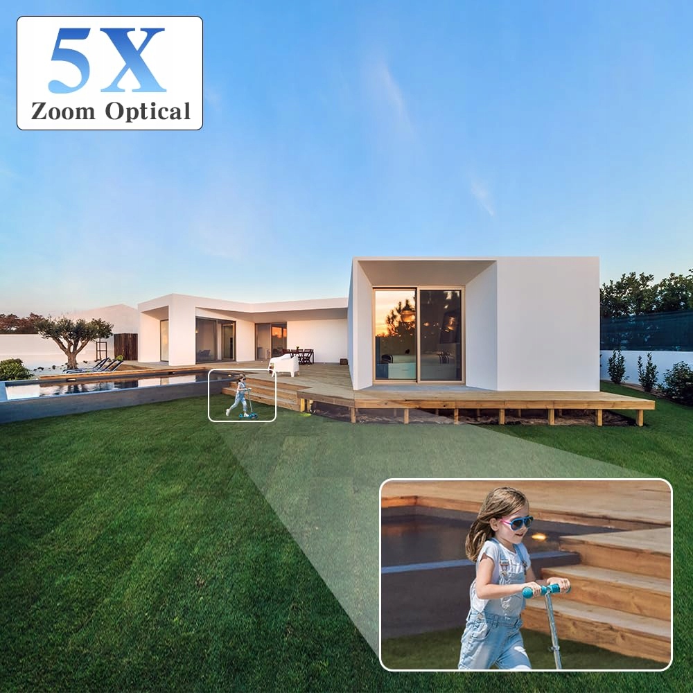 【5x optyczny zoom i kolorowa nocna wizja】Ta kamera do monitoringu na zewnątrz WLAN obsługuje 5x optyczny zoom i 4x zoom cyfrowy. Dzięki 5x optycznemu zoomowi możesz łatwo rozpoznać osoby z bliska lub obiekty z daleka. Ta kamera PTZ na zewnątrz posiada obiektyw 3,6 mm, który dostarcza niezawodne kolorowe i podczerwone obrazy nocne do 30 m – zarówno w dzień, jak i w nocy.