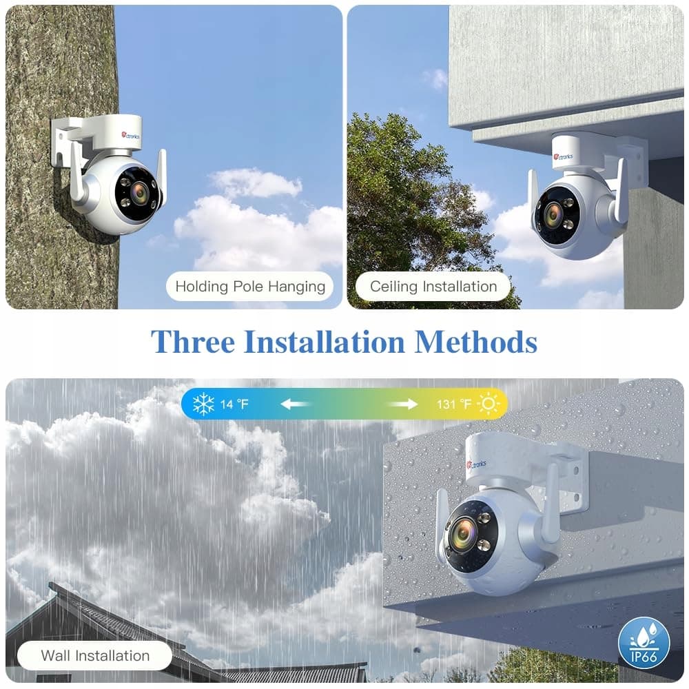 【Wodoodporność IP66 i 3 metody instalacji】Kamera do monitoringu na zewnątrz obsługuje montaż na ścianie, suficie lub maszcie, dzięki czemu możesz umieścić kamerę wszędzie – na dachach, w ogrodzie lub w innych miejscach. Dzięki klasie ochrony IP66 kamera WiFi 5GHz działa niezawodnie nawet w ekstremalnych warunkach pogodowych i jest idealna do parkingów, garaży, podwórek i podjazdów.