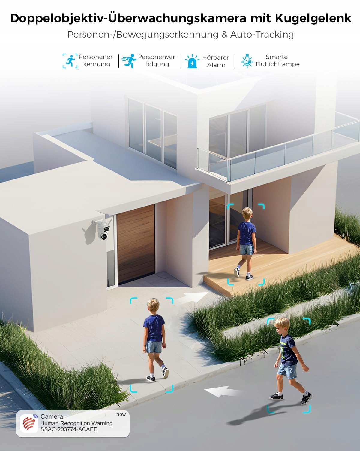 【Wykrywanie osób i dwukierunkowe audio】Inteligentna sztuczna inteligencja precyzyjnie wykrywa ruchy ludzkie i redukuje fałszywe alarmy spowodowane przez zwierzęta domowe lub warunki pogodowe. Po wykryciu otrzymujesz natychmiastowe powiadomienie i możesz bezpośrednio komunikować się przez wbudowany mikrofon i głośnik – powitaj gości, porozmawiaj z kurierem lub ostrzeż intruzów w czasie rzeczywistym.