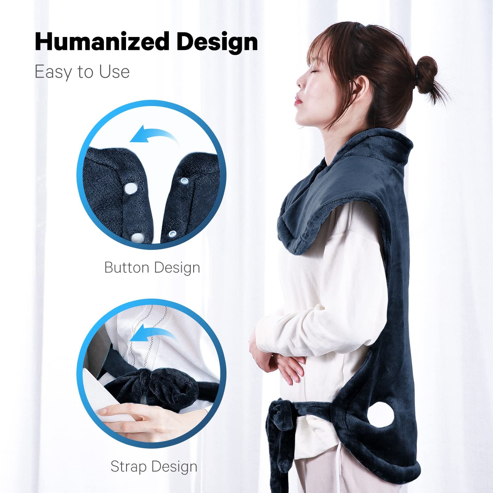 Super miękki flanel i bezręczne wzornictwo: Przyjazny dla skóry flanel jest elegancki w teksturze i miękki w dotyku, i pomaga przewodowi grzewczemu równomierniej rozprowadzać ciepło. 2 guziki i 2 paski pomagają dostosować rozmiar elektrycznej poduszki grzewczej na szyję i plecy, dobrze utrzymuje ciepło podczas noszenia elektrycznej poduszki grzewczej, dzięki czemu można ją cieszyć się wszędzie.