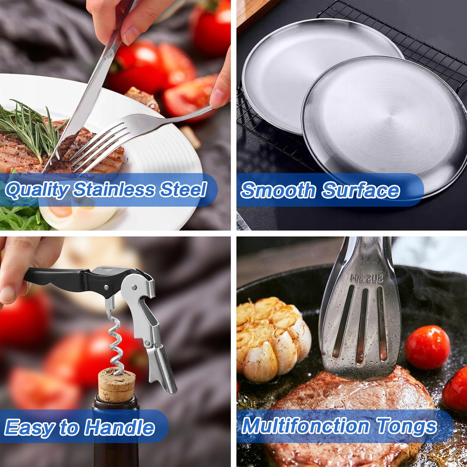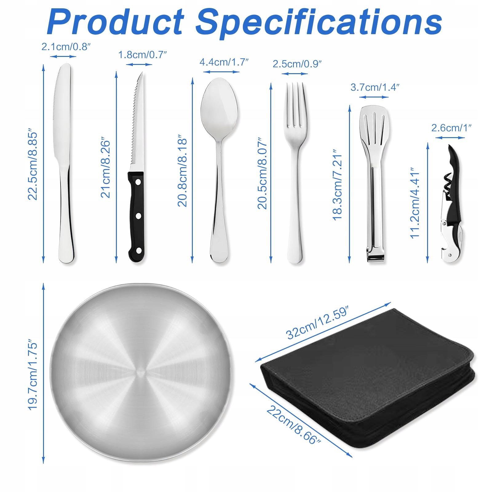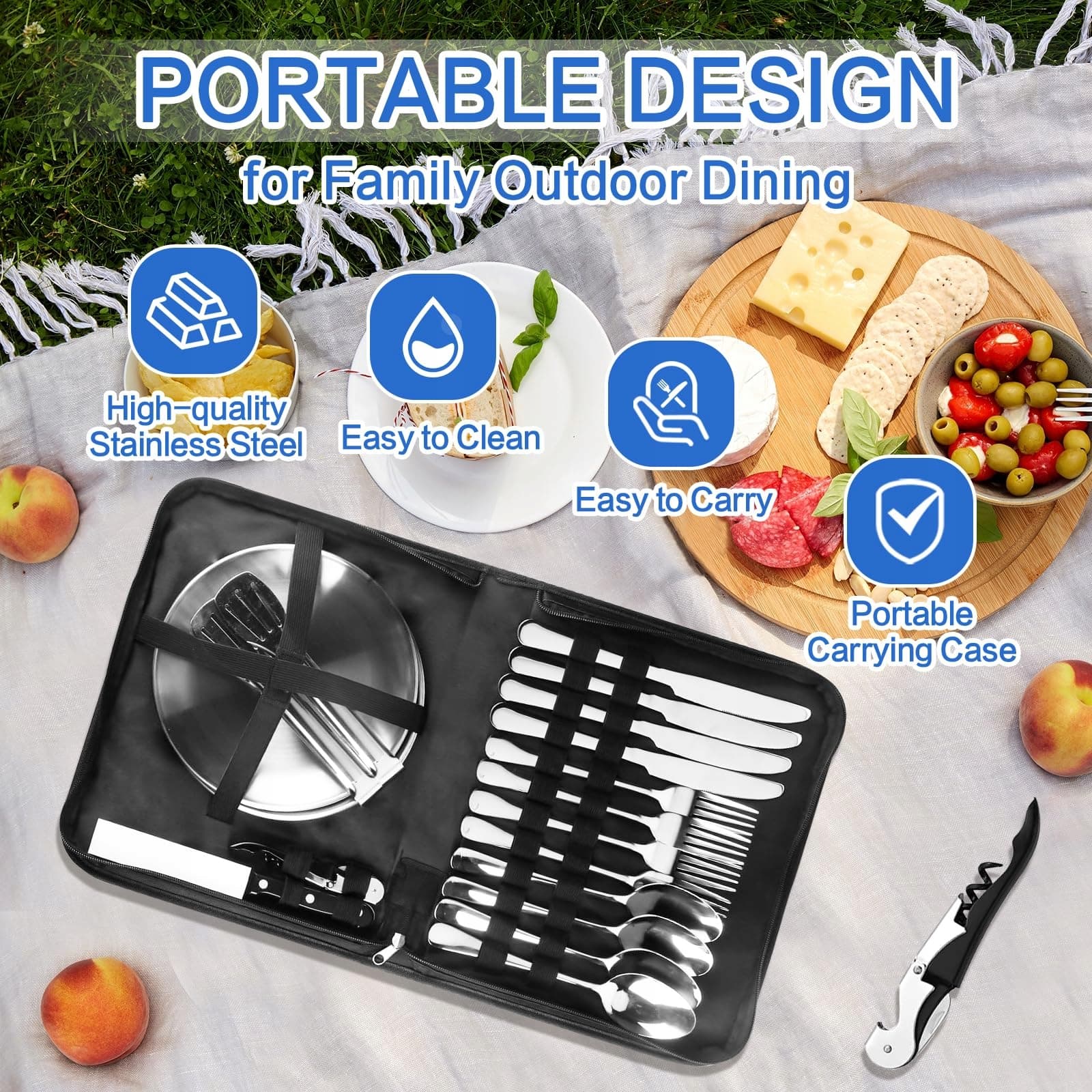 Cynrikah Zestaw naczyń kempingowych dla 4 osób, 20 elementów, akcesoria kempingowe, zestaw sztućców ze stali nierdzewnej, akcesoria piknikowe z otwieraczem do butelek, nożem do steków, łyżką, widelcem, nożem, talerzami do kempingu/grilla