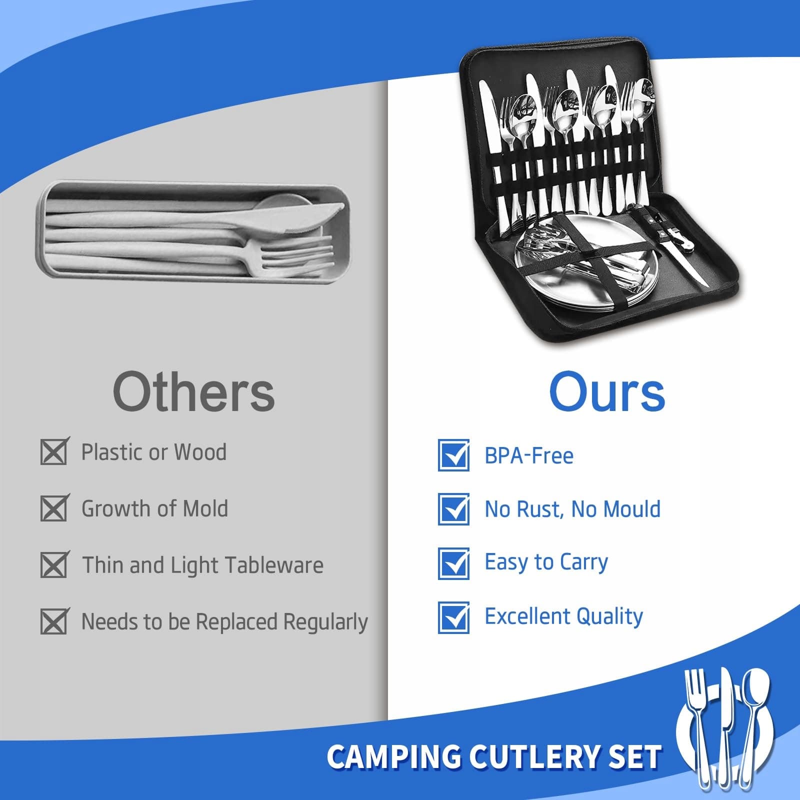 JAKOŚĆ PREMIUM: Ten zestaw sztućców kempingowych jest wysokiej jakości i bezpieczny dla dorosłych i dzieci, doskonale nadaje się na rodzinny piknik. Grubość i waga sztućców ze stali nierdzewnej odpowiadają temu, do czego większość ludzi jest przyzwyczajona. Dążymy do zapewnienia najwyższej jakości naczyń kempingowych oraz najbardziej komfortowego doświadczenia jedzenia na świeżym powietrzu, jakie kiedykolwiek było