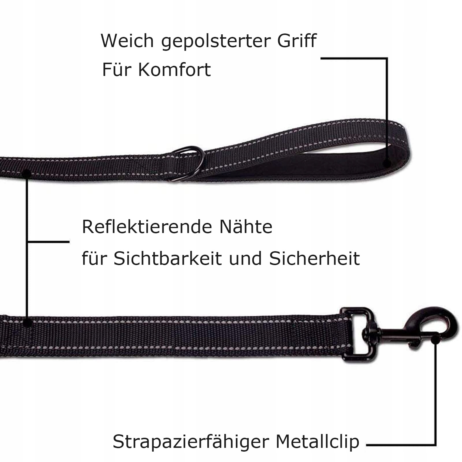 1,50M czarna smycz dla zabawnych, wysokiej jakości odblaskowych, smycz dla każdego psa - bez względu na to, czy jest duży, czy mały. Dwa uchwyty są wyściełane miękkim neoprenem, a klamra + D-ring są wykonane z wytrzymałego metalu