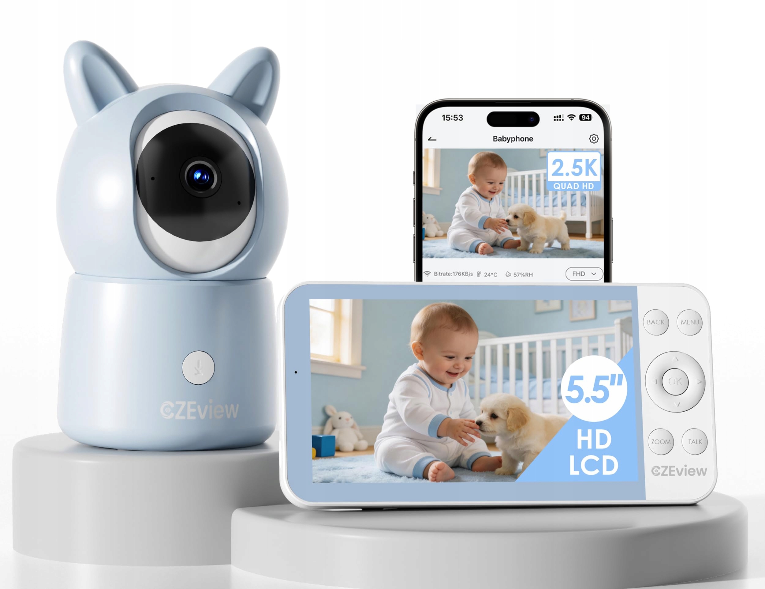 CZEview Niania elektroniczna z kamerą 2.5K i 5,5-calowym ekranem HD, noktowizja, 360° WLAN Video niania z aplikacją, muzyką i kolorowym światłem nocnym, inteligentne wykrywanie (Niebieski (1 sztuka))