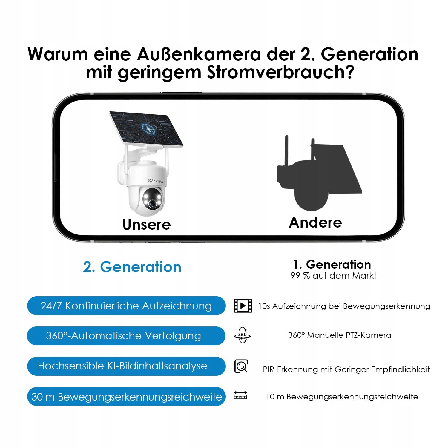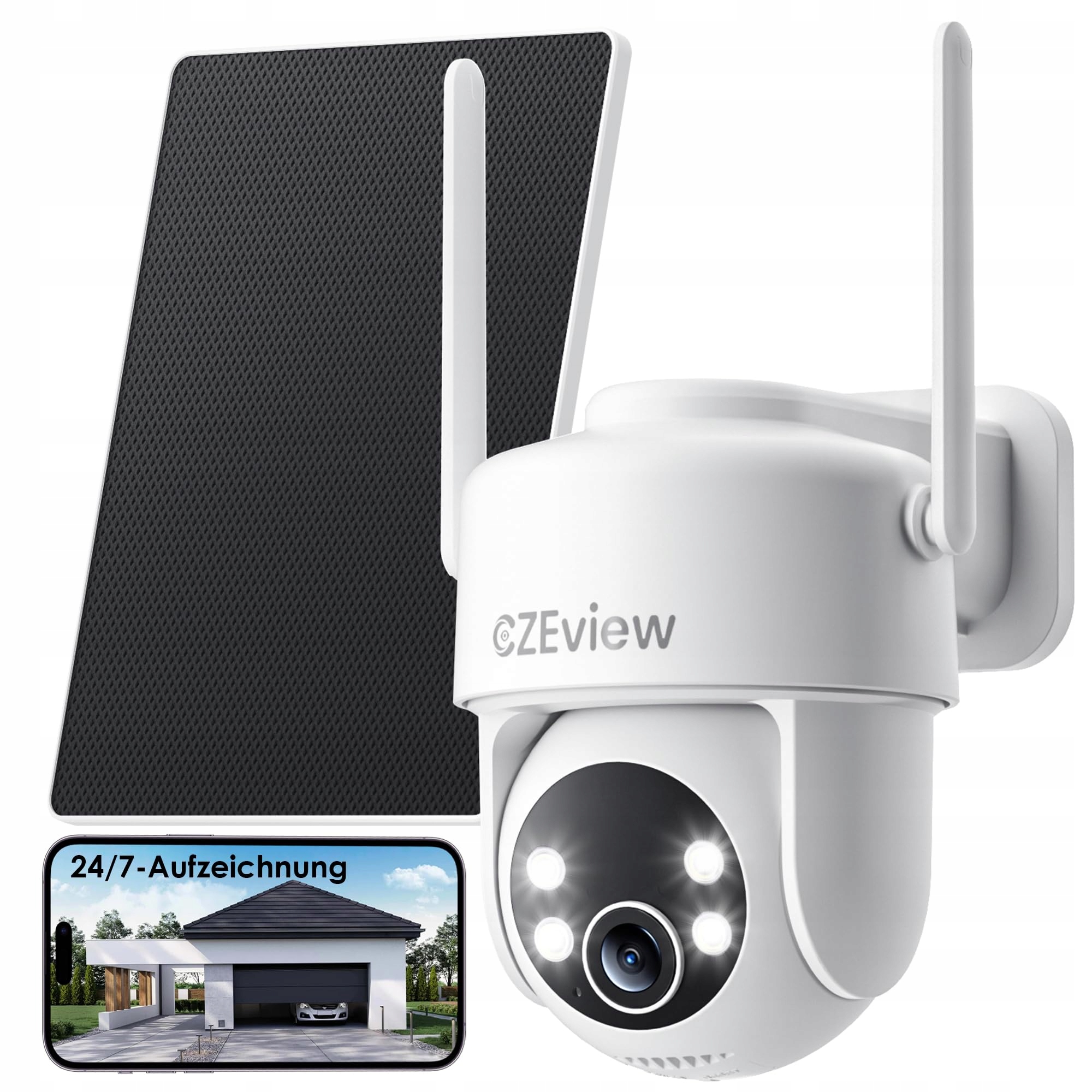 CZEview 2.Gen Kamera monitoringu zewnętrznego na baterię z panelem solarnym, ciągłe nagrywanie 24/7, automatyczne śledzenie, kamera 2K, 360° PTZ do monitoringu zewnętrznego, bezprzewodowa, 2,4 GHz WLAN (kamera 2. generacji)