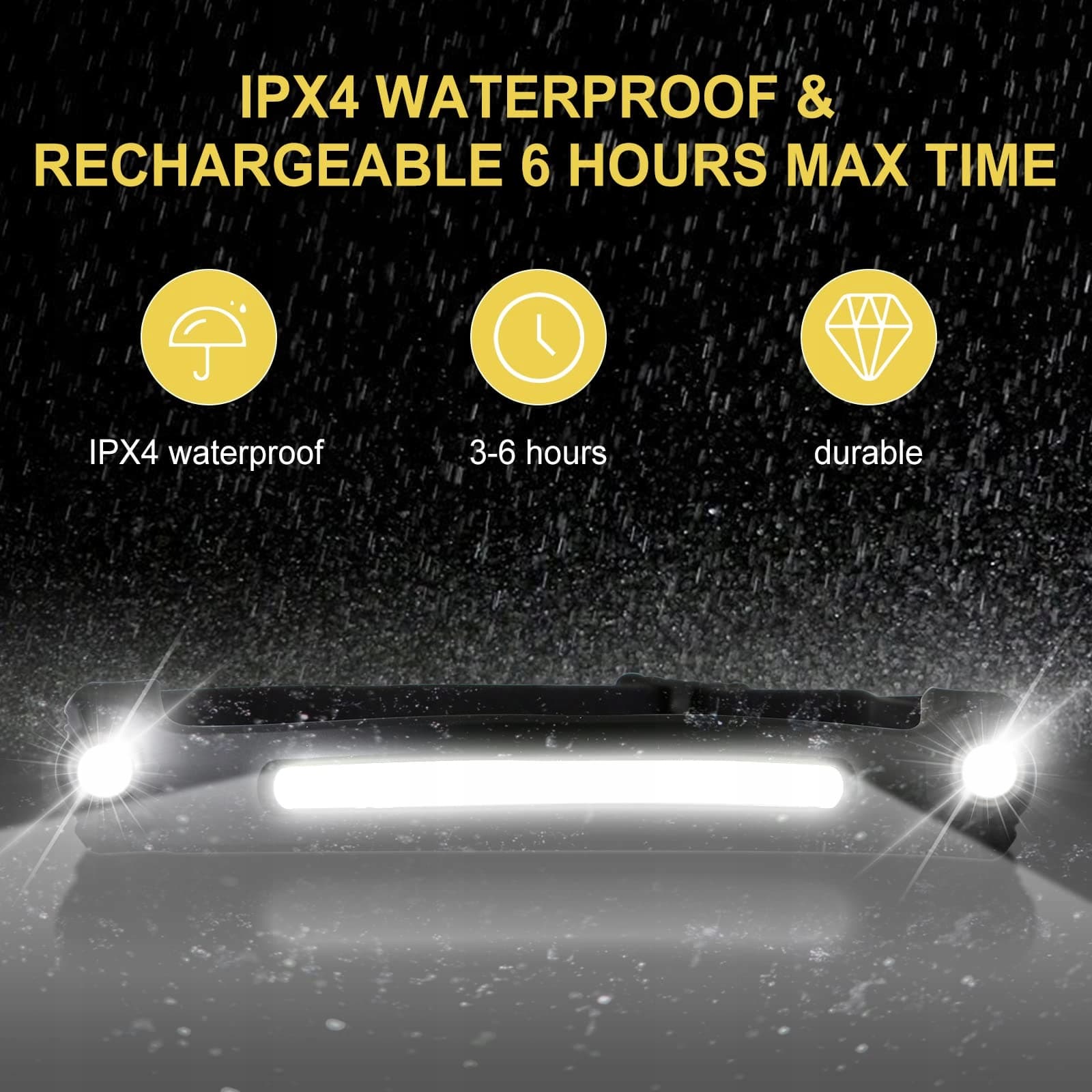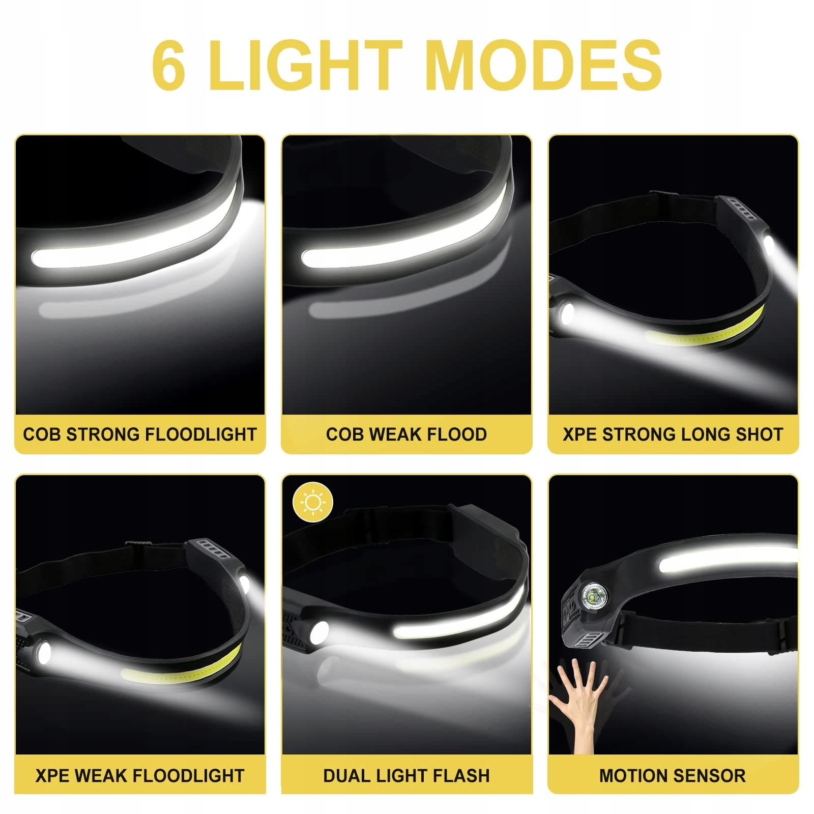 [6 trybów pracy i wodoodporność]Latarka czołowa ma 6 trybów jasności: COB Wysoki/COB Niski/XPE Wysoki/XPE Niski/COB i XPE Stroboskop/Sensor falowy. Dzięki unikalnej funkcji czujnika wystarczy pomachać ręką przed latarką czołową, aby ją włączyć/wyłączyć. Wodoodporność IPX4, jest bezpieczne używanie ładowalnej latarki czołowej nawet w deszczu.