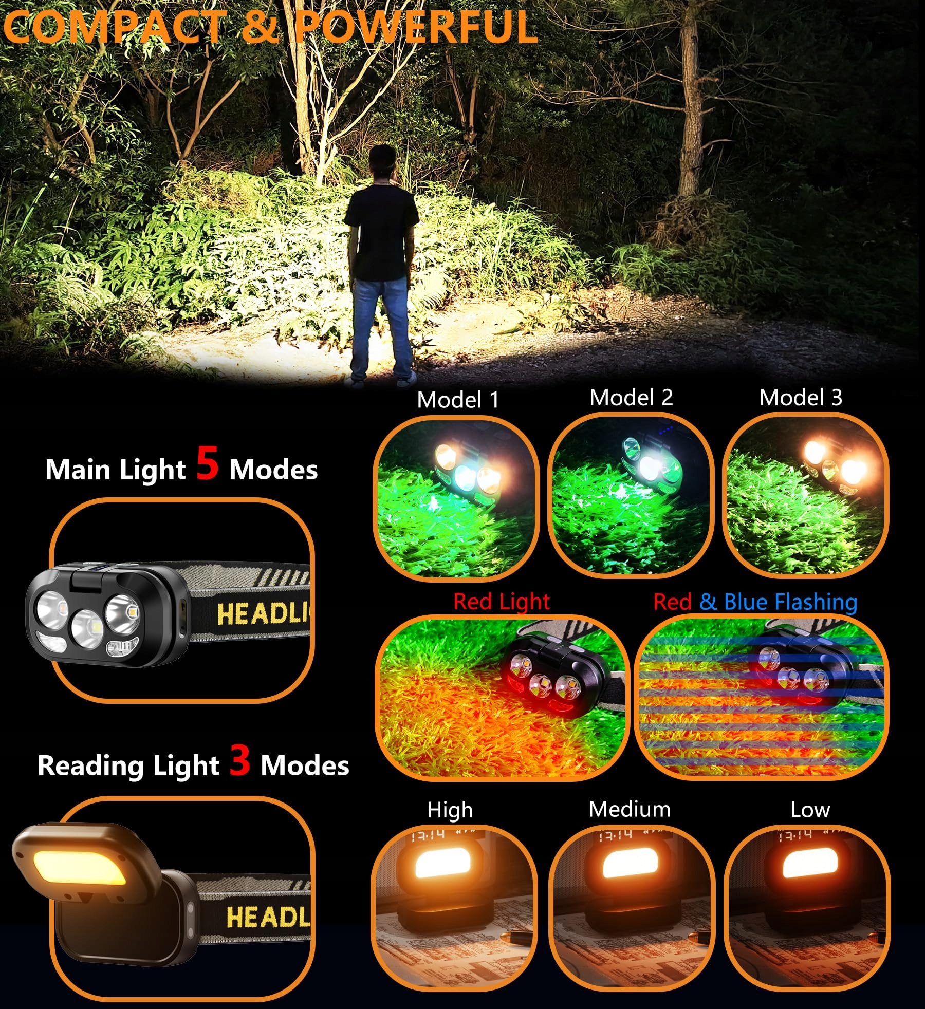 [Kreatywna latarka czołowa] Ta nowoczesna latarka czołowa oferuje imponujący zasięg oświetlenia od 300 do 500 metrów, dzięki czemu możesz wyraźnie dostrzegać swoje otoczenie. Kompaktowy i przenośny design uzupełnia praktyczny tryb czujnika, który umożliwia obsługę bez użycia rąk. Gdy urządzenie jest wyłączone, możesz po prostu obrócić latarkę czołową, aby aktywować lampkę do czytania.