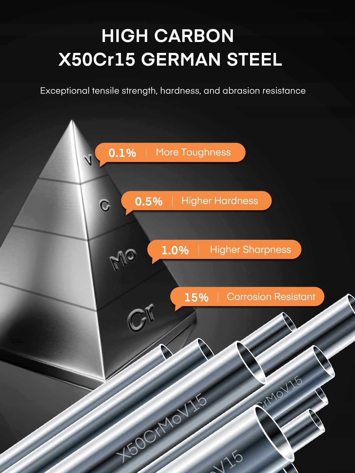 WYSOKIEJ JAKOŚCI ZESTAW NOŻY: Ostrza wykonane są z wysokiej jakości stali nierdzewnej (X50CrMo15), która jest niezwykle trwała; twardość Rockwella HRC55±2 czyni go jednym z najtwardszych zestawów noży w swojej klasie. Dzięki temu kroisz wszystkie składniki, których potrzebujesz do swoich potraw, bardzo precyzyjnie i bez wysiłku.