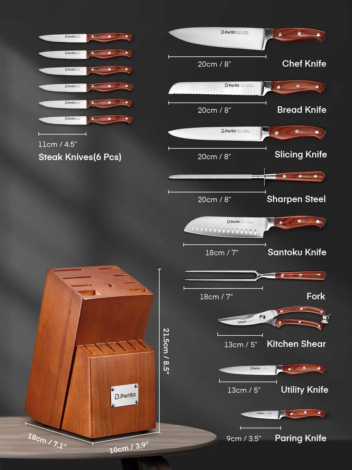 D.Perlla Blok noży | Zestaw noży | 16-CZĘŚCIOWY zestaw noży z drewnianą rączką | Zestaw noży kuchennych ze stali nierdzewnej z drewnianym blokiem | Profesjonalne noże kuchenne z ostrzałką