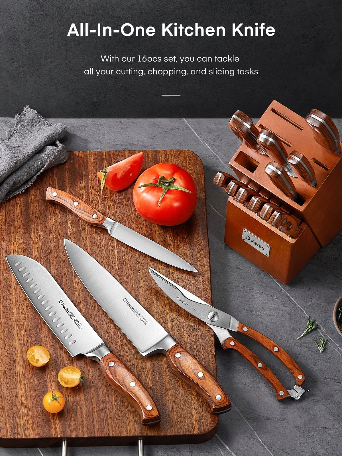 D.PERLLA 16-Piece Stainless Steel Knife Set with Wooden Handle