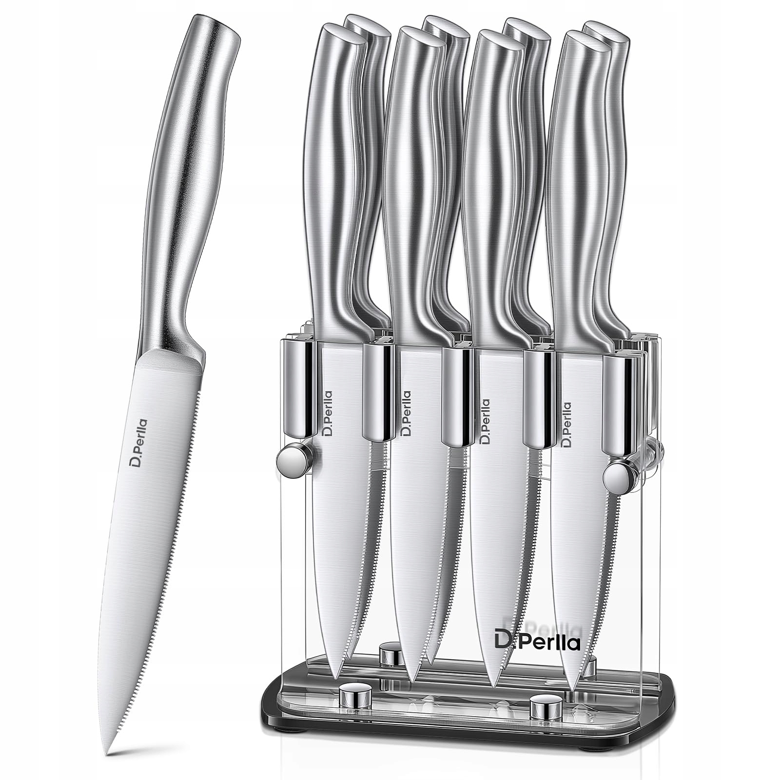 Zestaw noży do steków D.Perlla 9 części, stal nierdzewna zestaw sztućców do steków, ostre noże do steków z ergonomicznymi, antypoślizgowymi uchwytami z akrylowym stojakiem na noże, akcesoria grillowe, srebrny