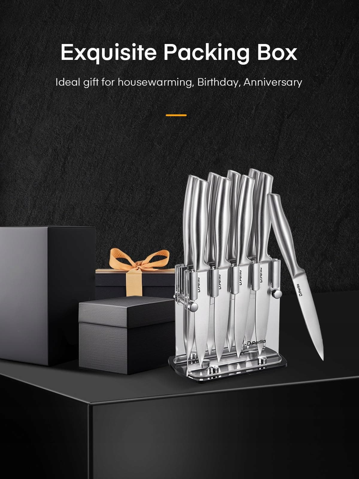 Łatwe do przechowywania: Nasz zestaw noży do steków z przezroczystym stojakiem na noże z akrylu. Ten stojak na noże z akrylu jest łatwiejszy do czyszczenia niż tradycyjne bloki na noże i zajmuje mniej miejsca.