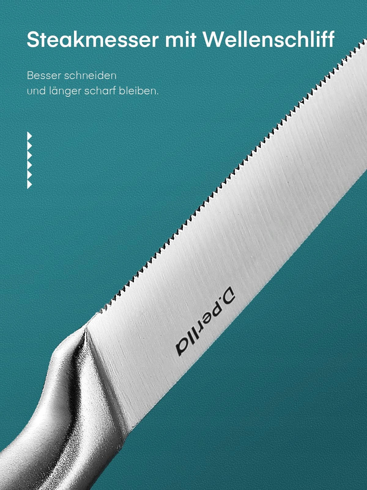 Zestaw noży do steków D.Perlla, stal nierdzewna, zestaw sztućców do steków dla 8 osób, dłuższe noże do steków z ergonomicznymi, antypoślizgowymi uchwytami, akcesoria do grilla, srebrny