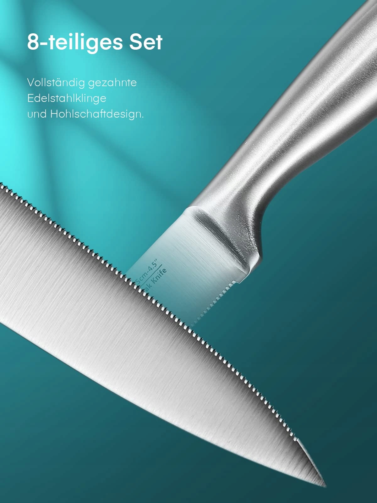 Wysokiej jakości stal nierdzewna: Zestaw noży do steków wykonany jest ze stali nierdzewnej, co zapewnia trwałość i odporność na korozję.