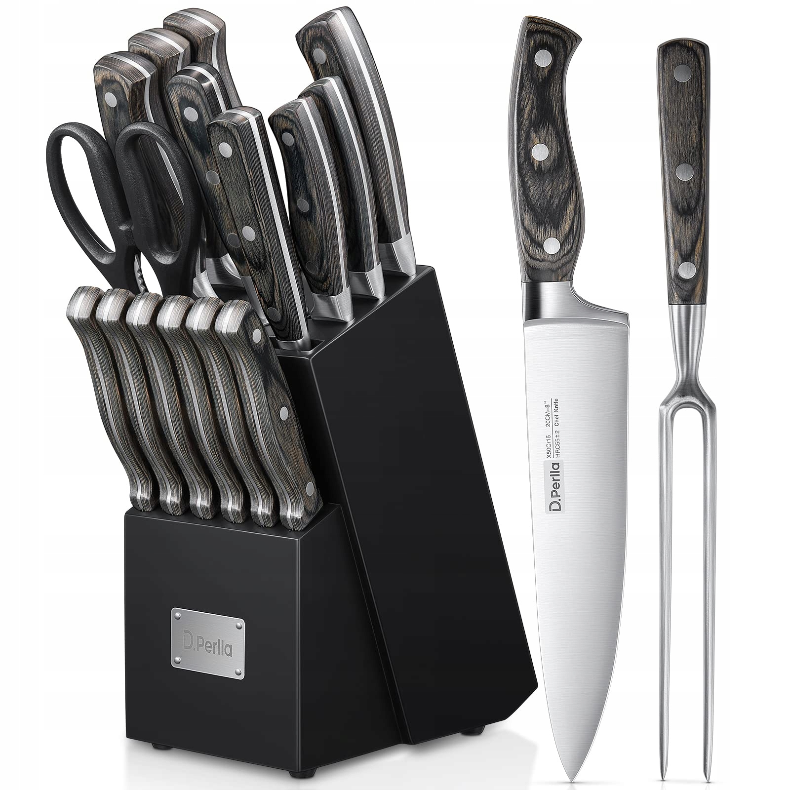 D.PERLLA Zestaw Noży Kuchennych 16 Sztuk z Drewnianym Uchwytem i Blokiem