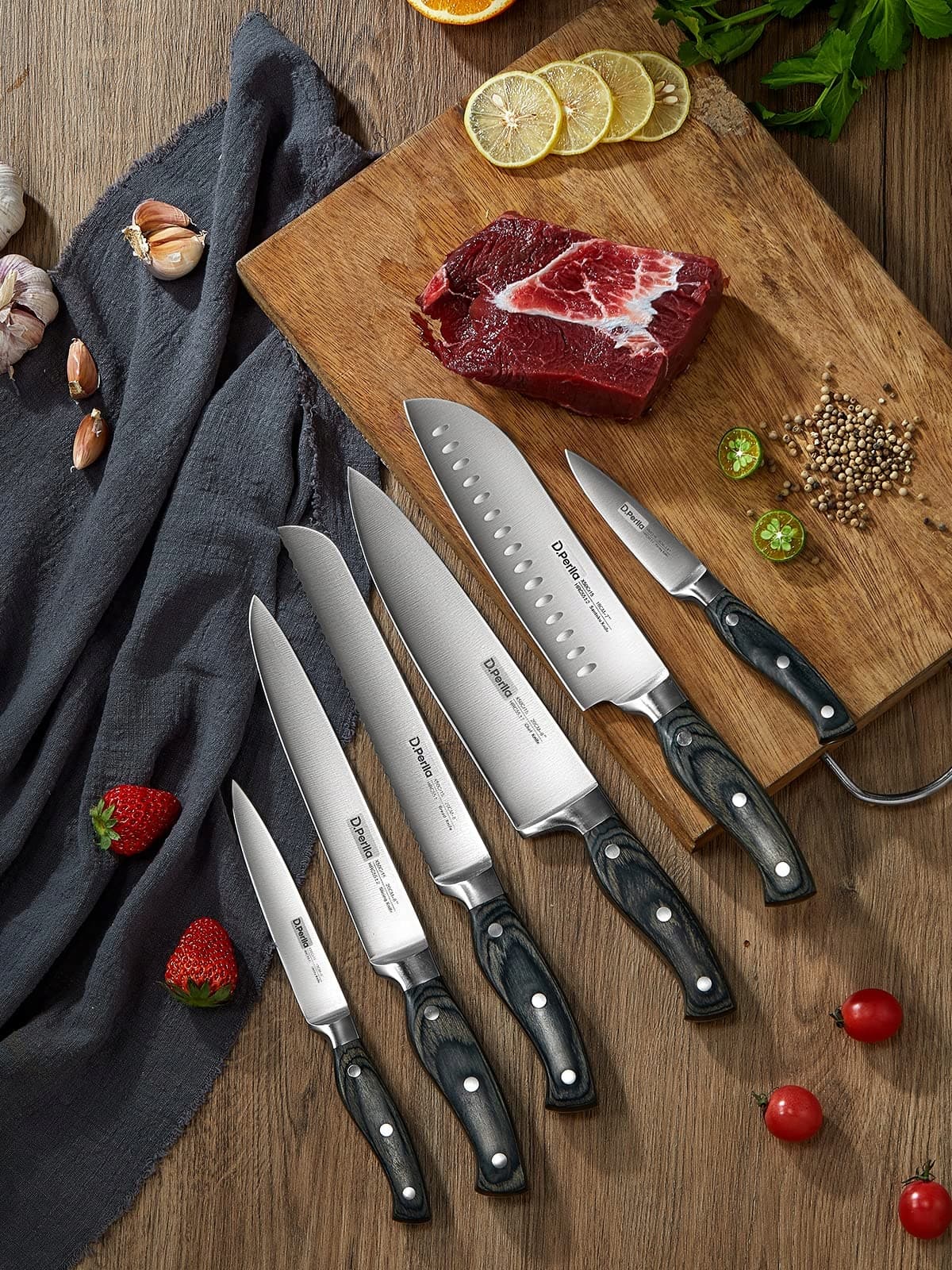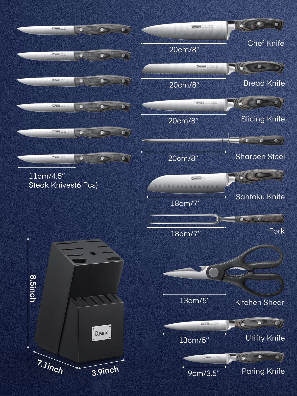 D.PERLLA Zestaw Noży Kuchennych 16 Sztuk z Drewnianym Uchwytem i Blokiem | Premium Supply