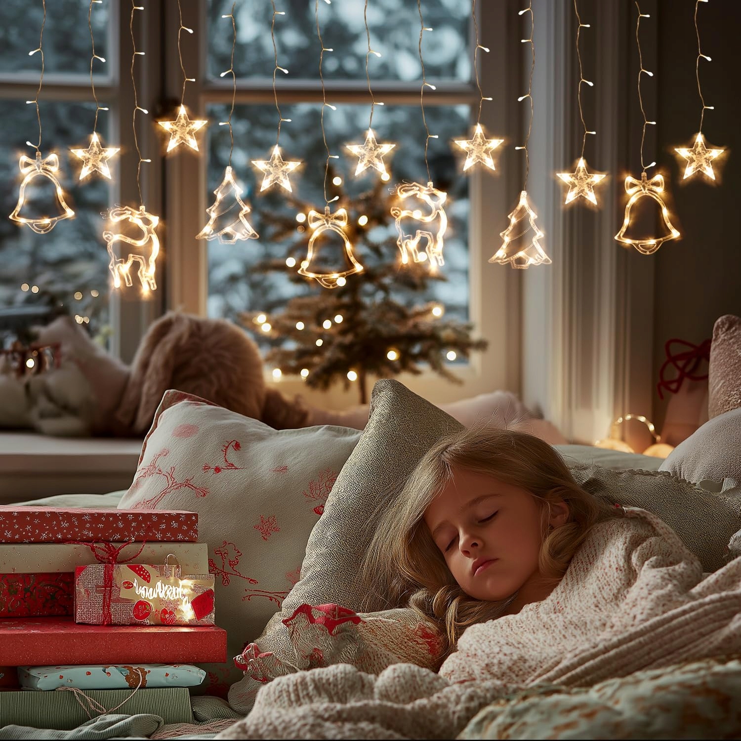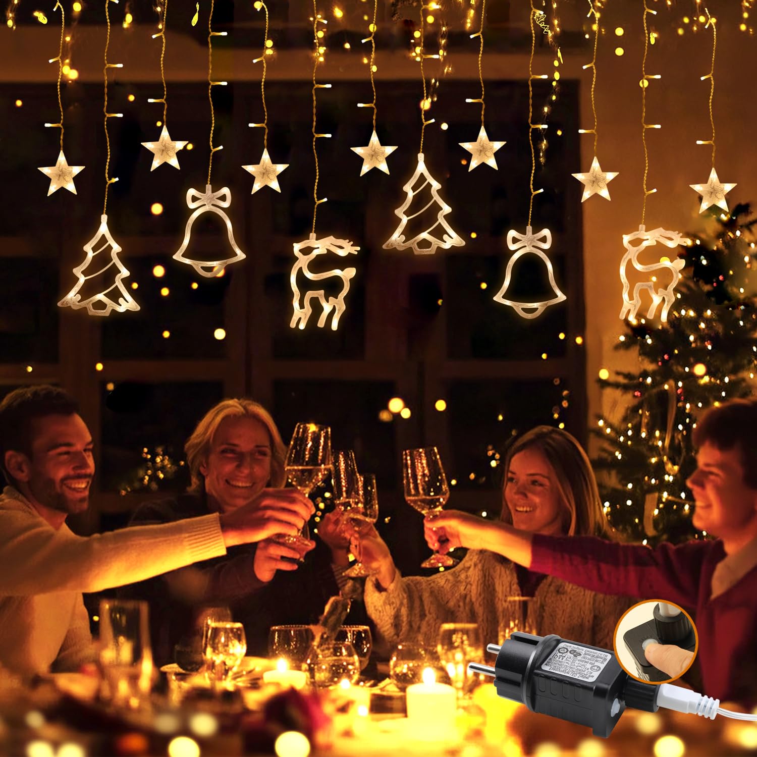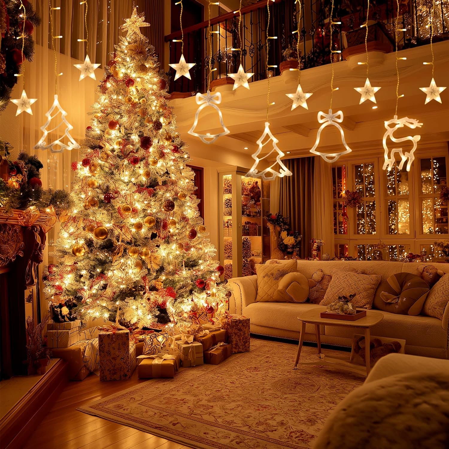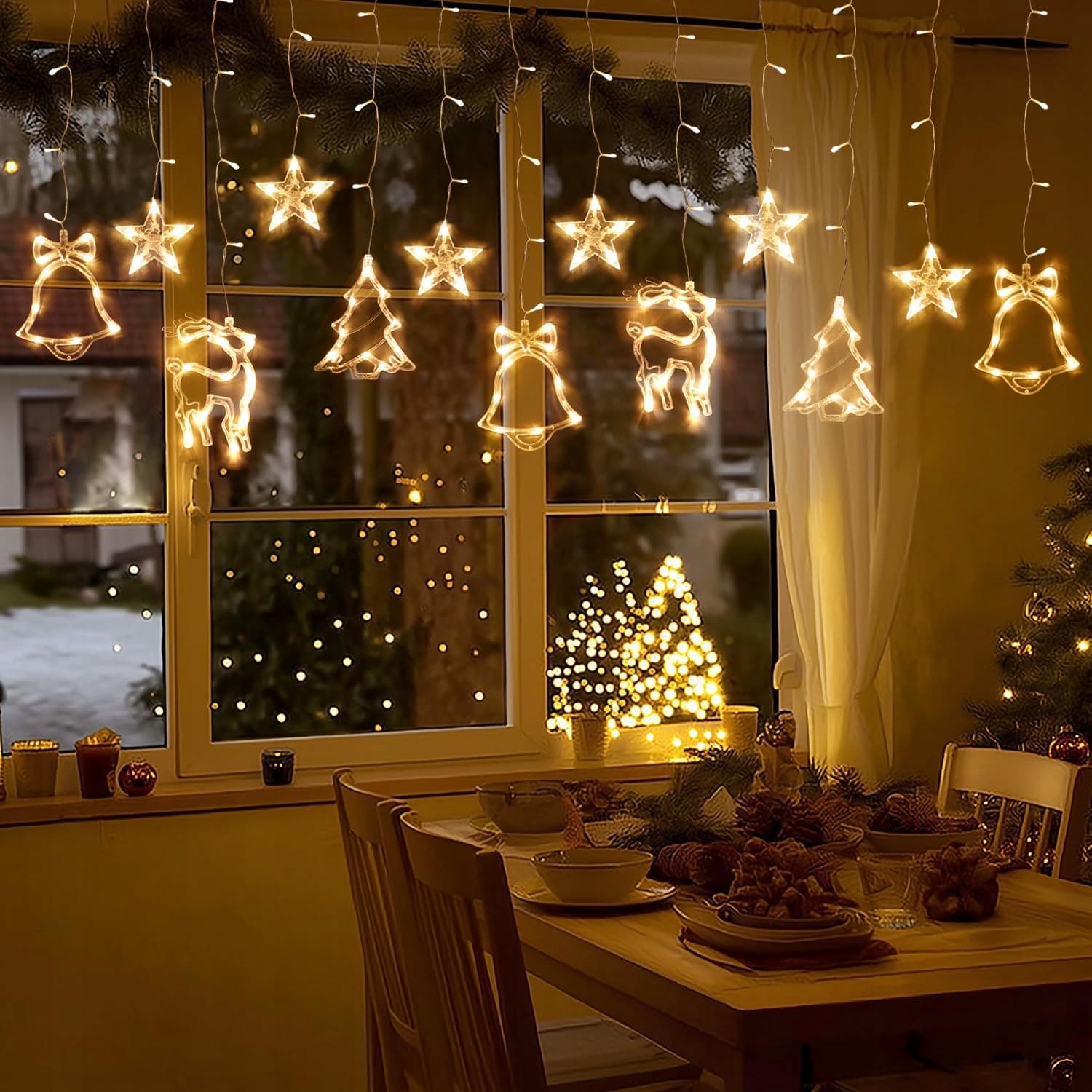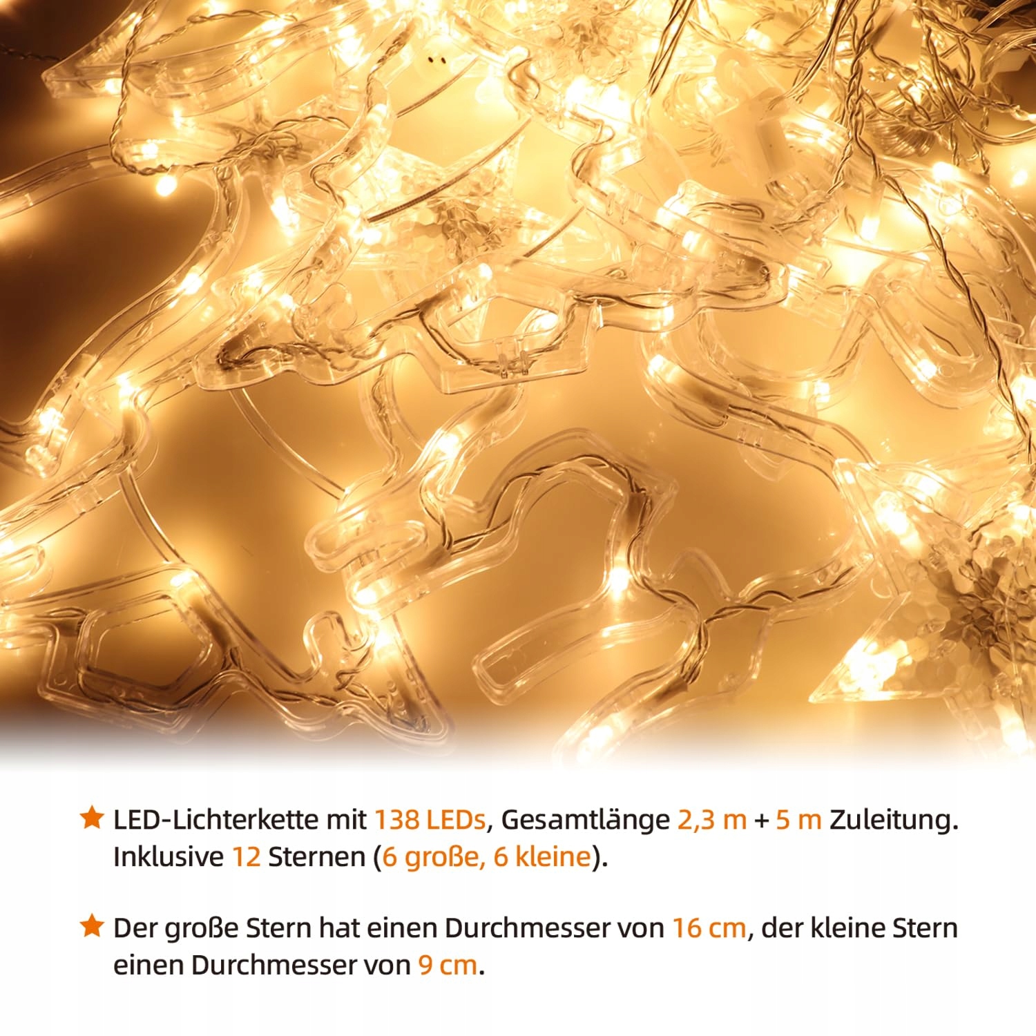 Elegancki design – Oświetlenie o długości 2,3 m składa się z 12 zwisających sznurów świetlnych, których dolne końce ozdobione są zawieszkami LED w kształcie gwiazd, choinek, reniferów i dzwonków. 5 m przewodu zasilającego dla elastycznego rozmieszczenia.