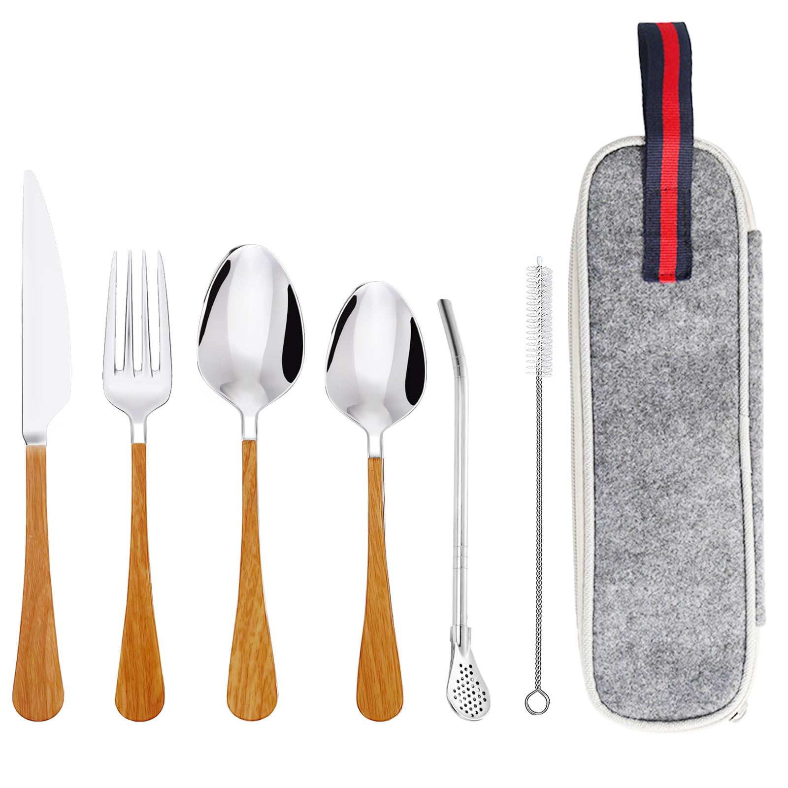 Daily Treasures 6-częściowy zestaw sztućców ze stali nierdzewnej, sztućce podróżne z drewnianą rączką z torbą do przechowywania, wielorazowy zestaw nóż widelec łyżka & łyżka z filtrem słomka, przenośne przybory do biura i na kemping