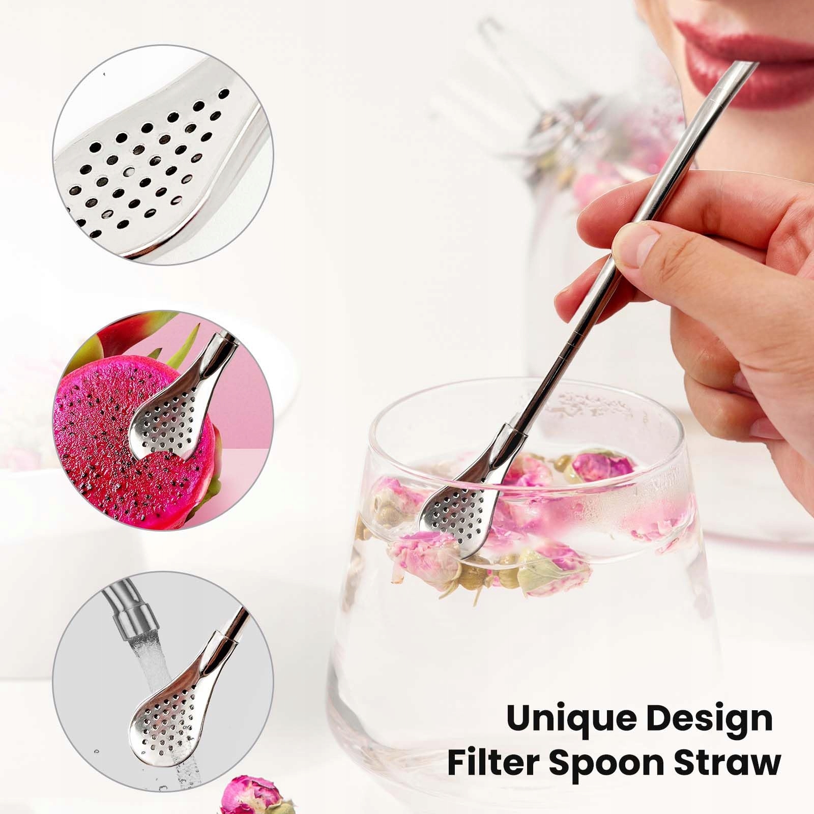 【Unikalny design & praktyczna łyżka ze słomką z filtrem】 Unikalna łyżka ze słomką o długim trzonku z filtrem posiada konstrukcję 3 w 1, łączącą funkcje łyżki, słomki i filtra, co jest bardzo wygodne i praktyczne. Wielorazowa łyżka z filtrem łatwo rozwiązuje problem zasysania resztek filtra, co jest świetne dla osób, które lubią ręcznie mieloną kawę lub herbatę bez obaw o wdychanie resztek filtra. Zestaw sztućców do lunchboxa jest również wyposażony w szczotkę do czyszczenia, która pozwala łatwo wyczyścić wnętrze słomki bez obaw o zabrudzenia