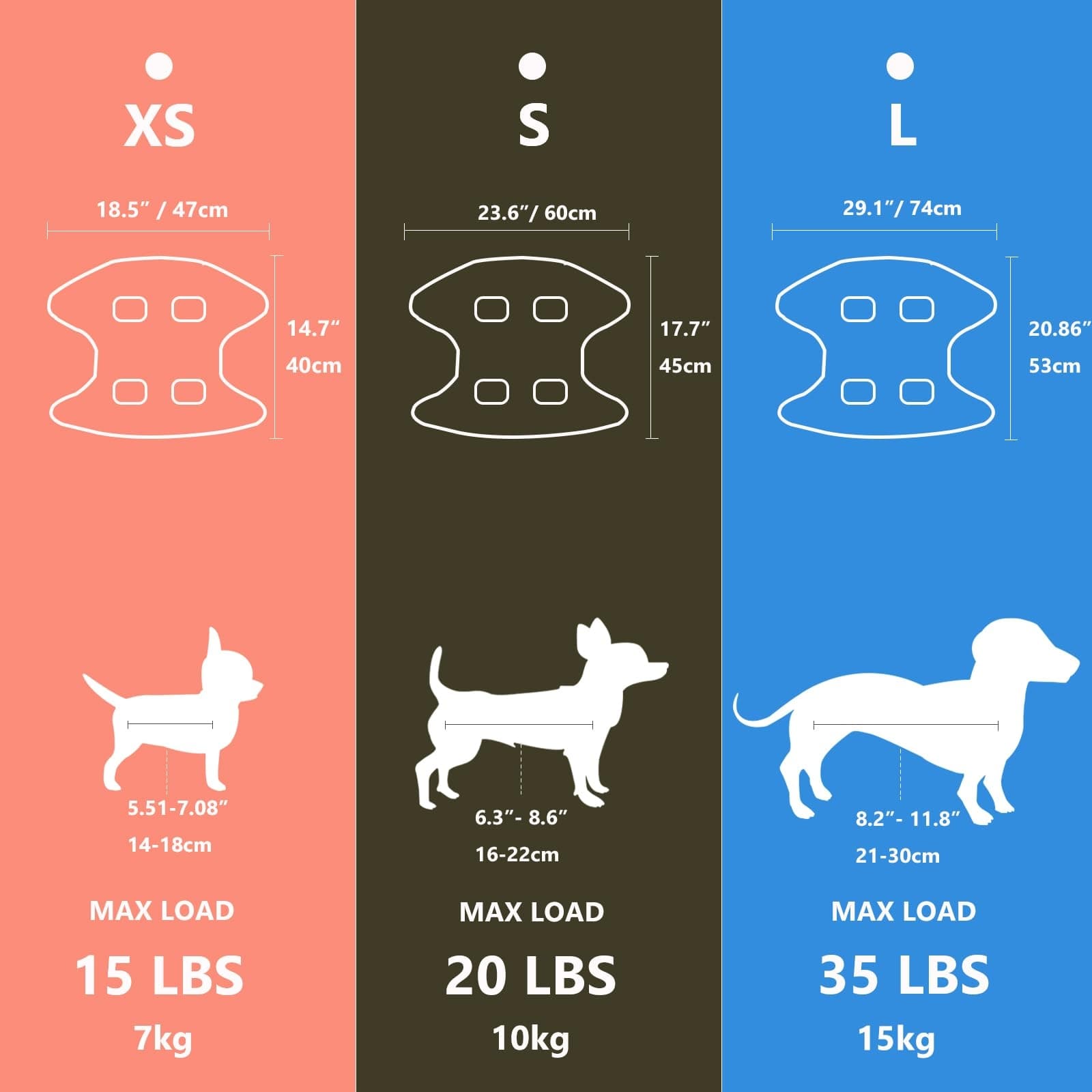🐕 DUŻY ROZMIAR - dla średnich psów odległość między przednimi a tylnymi nogami wynosi (25 - 29 cm) i utrzymuje psy do 15 kg. Odpowiedni dla większości średnich psów, takich jak Beagle, Bulldog, Beagle, Corgi, Jamnik, Jack Russell Terrier.