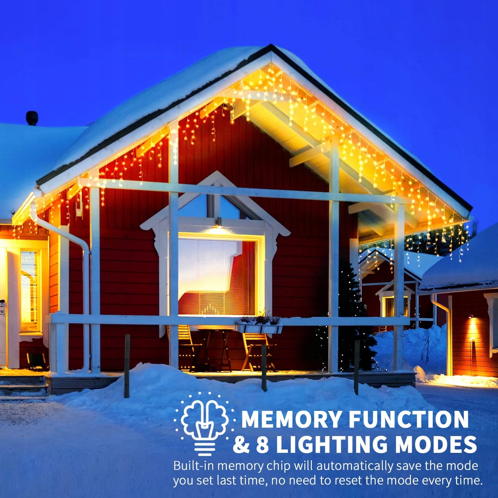 Zapisz wybrany tryb: Oświetlenie świąteczne na zewnątrz posiada 8 różnych trybów, a wbudowany chip pamięci automatycznie zapisuje tryb, który ustawiłeś ostatnim razem, dzięki czemu nie musisz za każdym razem resetować trybu. Możesz puścić wodze wyobraźni i używać różnych trybów oświetlenia w zależności od sytuacji.