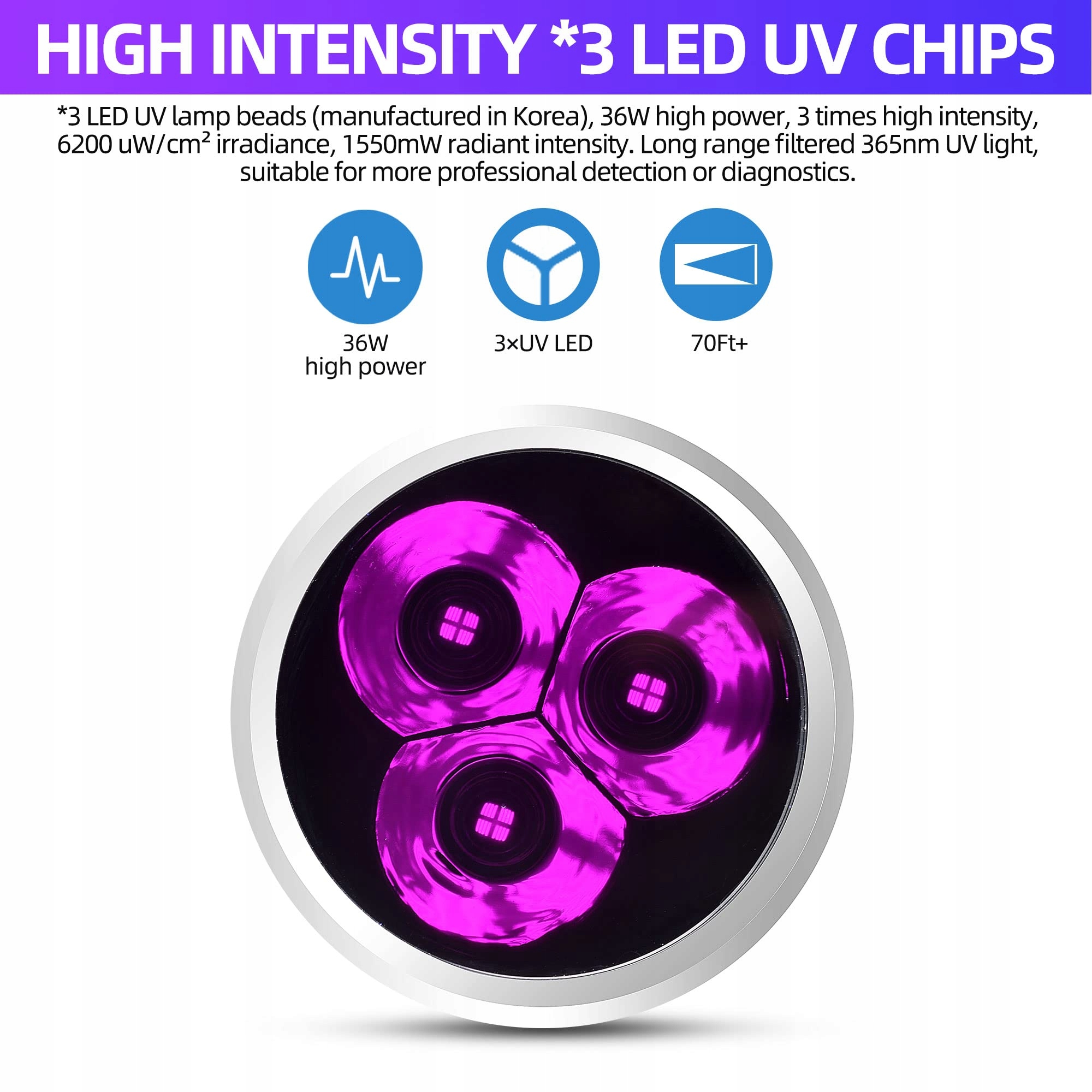 ★[ZAAKTUALIZOWANE, ABY SPEŁNIĆ TWOJE POTRZEBY]-- To jest reflektor czarnego światła, który integruje wysoką czystość, wysoką intensywność i dużą zasięg ✔ Filtrowane i czyste uv 365nm Ultrafiolet. ✔ 3 LED-y mocne 365 UV-światło, o wysokiej mocy 36W i 1550mW intensywności promieniowania. ✔ Ponad 25M zasięgu, aby łatwo znaleźć to, czego szukasz. Z CZTEREMA akumulatorami o wysokiej pojemności (z płytką ochronną, 8 godzin żywotności akumulatora).